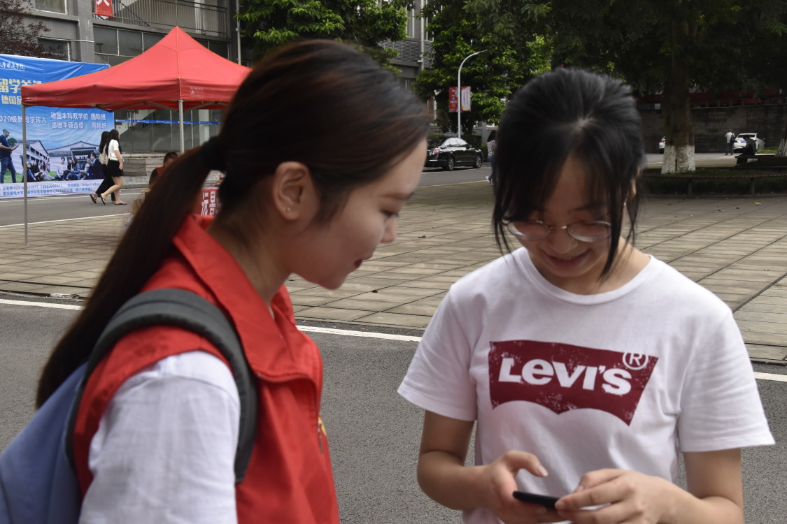 在人群队伍中,始终能看到身穿红马甲的学长学姐穿梭其中,他们关注着每一个经过的前来报到的学生及家长,遇见面有难色,或是在观望寻找者,就立刻上前温馨地询问遇见什么困难,并及时讲解或指引替前来报到的新生们答疑解惑,也在无形中舒缓着移通学院排队的人潮。他们就是创意写作志愿团(创意写作文化推广志愿服务专项支队)。