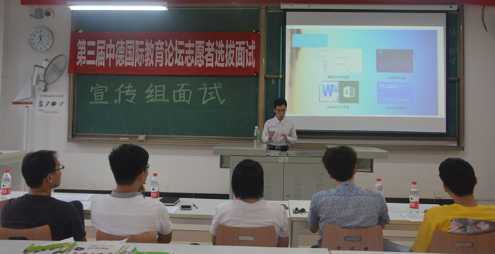为做好第三届中德重庆国际教育论坛志愿者选拔工作,中德重庆国际教育论坛组委会于6月18日、19日晚在第六教学楼304及306教室举行了专场主题面试。担任此次活动的评委是论坛组委会各小组的教师代表。