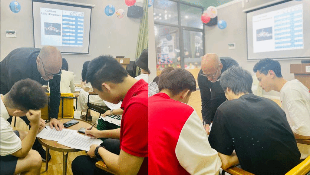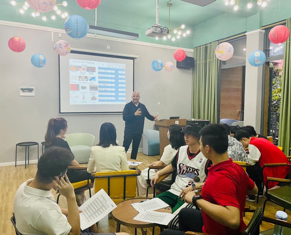 活动伊始,外教Peter针对本次沙龙主题对现场师生进行了合理分组并创设情境:好朋友们乘坐游轮出海旅行,航行途中突遭大火,只得弃游轮乘坐小救生船,在游轮上找到15件物品,请将这些物品根据重要性进行排序并确保带走的物品都是最有用的,以此达到自救的目的。每位参与者在物品单上写下自己的排序,然后进行小组讨论,最后记录下本小组讨论结果。
