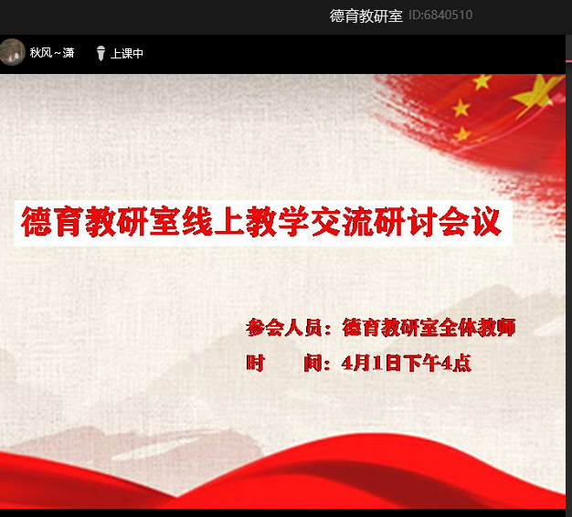 4月1日下午4点,思政教学部德育教研室召开例行集体备课会议线。此次会议主要围绕三个主题展开:一是学习教学督导与质量评价中心的《线上教学授课质量评价参考依据》,二是进行网络授课经验交流,三是研讨在线教学转为课堂教学的预案。本次会议由思政教学部德育教研室主任杨勇主持,教研室全体教师参加。
