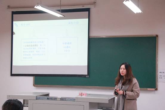 第二位进行说课的是乌兰老师。她为大家描述德语是由语音发声进阶到应用技能型语言的特色课程。她分析大一新生的学习能力与情况,以多样的授课、测试方式帮助学生克服畏难情绪,以丰富的内容循序渐进地引导学员进入学习。她指出,学习好德语不仅要达到发音标准、词汇量及格、掌握基本日常会话用语的目标,还应了解德国概况、风土人情和名人轶事。说课中,乌兰老师热情地进行现场教学,台下教师们积极配合发音,体会一番异国文化。她说明,德语的学习不仅关键在发音这一环节,更是难在将语言完美地书写出来,因此会特别注重加强对学生的书写练习。