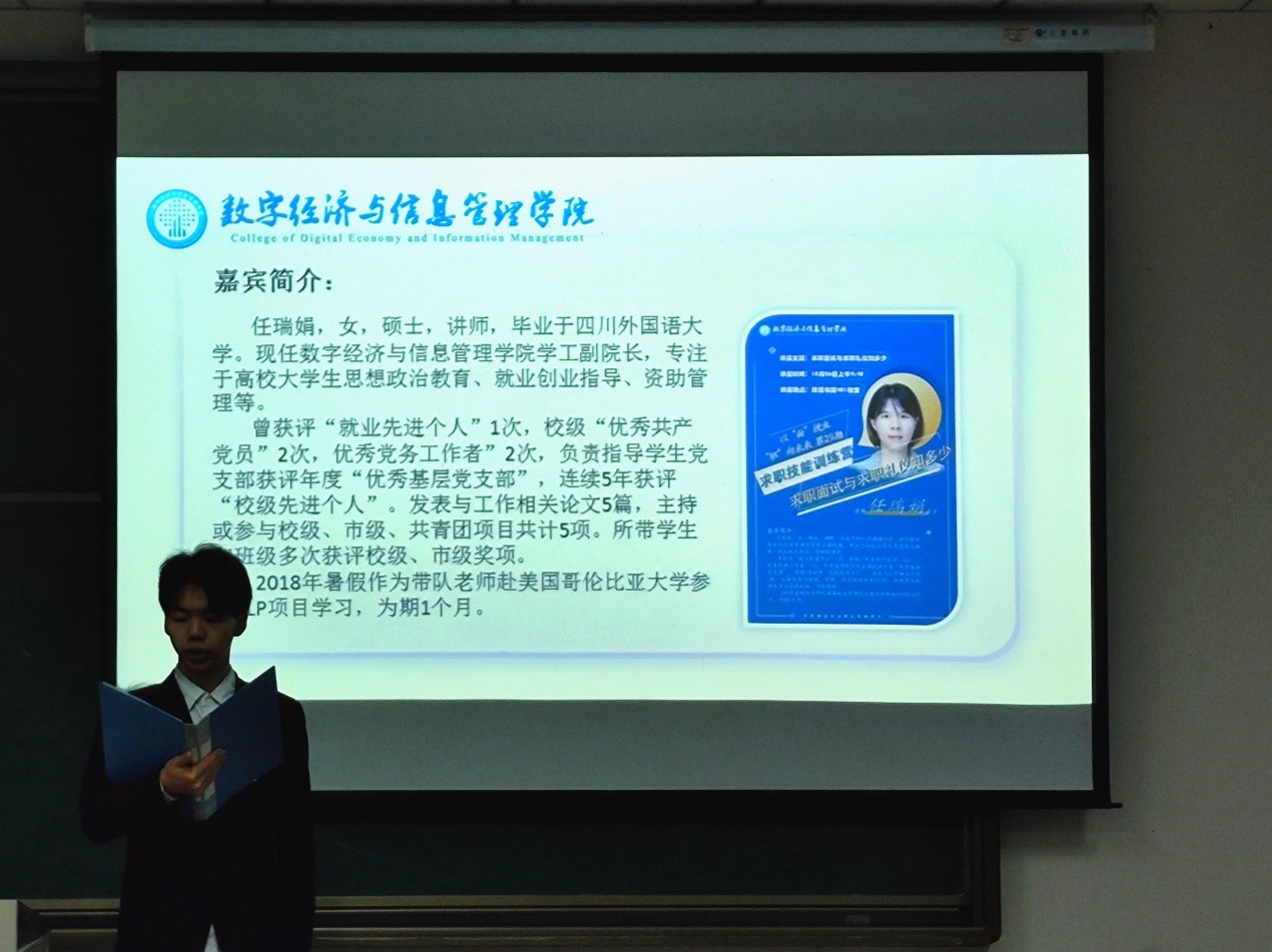 为认真贯彻落实习近平总书记关于就业工作的重要指示和党中央决策部署,将稳就业、保就业、促就业作为重要政治任务、作为头号民生工程来抓,以强有力、突破性、组合式的政策措施力保就业局势稳定。重庆移通学院数字经济与信息管理学院于10月26日上午在双栀书院401教室开展“以‘面’授业,‘职’向未来”第29期求职技能训练营,本次讲座特邀到数字经济与信息管理学院学工副院长任瑞娟老师为大家开展“求职面试与求职礼仪知多少”主题培训。