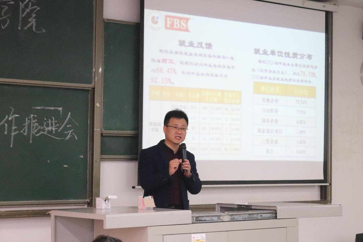 会议伊始,梁院长对我院2020届就创工作进行了汇报。从习近平主席的三句话切入主题,强调了高校毕业生落实就业的重要性,展示了商院在就业去向落实率方面的成绩以及2020级毕业生就业性质的分布。从毕业生就业反馈、就业单位性质分布、考研情况、考公情况等四个方面展示了上学期学院对推进毕业生就业工作制定的规划和采取的措施,进而体现了商院对毕业生就业工作的重视。