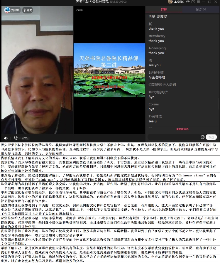 刘教授给我们展示了唐三彩、青花瓷、中国龙等代表中国文化的图片,从文化与跨文化交际的定义出发,生动自然地讲解了英语学习与跨文化交际的关系。他呼吁同学们勤学多思,利用文化知识来帮助英语学习与跨文化交际。同时刘教授对美国与中国应对疫情的不同态度提出了自己的观点,通过时事向我们解答了如何避免跨文化交际中的失误。期间多次提问,同学们积极回答,刘教授与我们热情互动,课堂气氛活跃非凡。直播结束,直播间的同学们纷纷向刘教授致谢道别,其中两百余名同学写下了自己的观后感。
