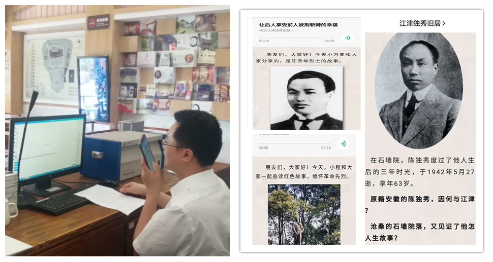 活动伊始,王昌旭主任给同学们简要介绍了此次红色故事的主要人物,然后利用微信公众号“江津独秀旧居”链接其余两位讲解员进行讲解。万晓露为同学们讲解了“陈独秀:身处艰难气若宏”及“让子孙后代享受前人披荆斩棘的幸福”的故事;程津为同学们讲解了“陈延年:革命者只有站着死,决不下跪”的故事,陈独秀的儿子陈延年、陈乔年也在中国共产党的历史上留下了浓墨重彩的一笔,展示出了中国革命先驱的铮铮铁骨和大无畏的奉献精神。