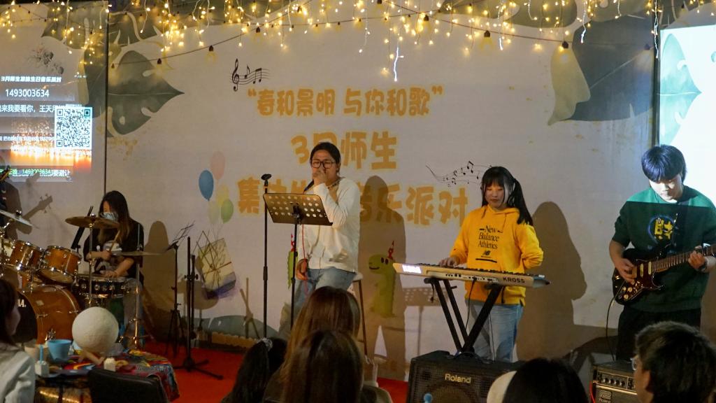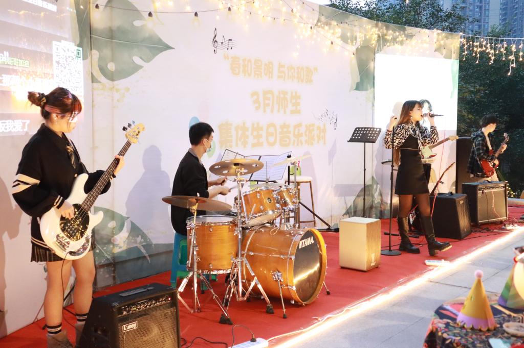 伴随着来自校乐团Wet Temptation乐队的乐音响起,在座寿星和嘉宾观众的目光聚焦到舞台之上,师生集体生日会正式开启。“请你相信伙伴,他们值得依赖,这就是翅膀,让你飞起来……”一首欢快激昂的《翅膀》献给三月生日的寿星师生们,每一个乐音、每一段和弦,一词一句无不吟咏着对生日的祝福,诉说着同学们的脉脉情谊。现场的观众们纷纷挥舞起了手臂,在温暖热烈的氛围中传达着真挚的祝愿,醉人的歌声随着音乐流淌,欢乐的乐章传遍整个校园。