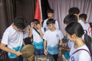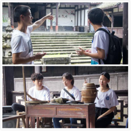 有志愿者问起这座川主庙建于哪个朝代,负责人走到一边的看台,指着屋檐上的脊梁,上面写着“道光”两个字,据此猜测是道光年间建造或修缮。随后便走上了老戏台,感受着因为川主庙带来的历史气息和文化底蕴。志愿者们看到放在一旁的锣、镲和板鼓,便来了兴趣体验了一下戏曲伴奏,拿起乐器统一节奏地敲了起来。志愿者们通过亲身体验中国戏曲,深感戏曲的独特魅力,也会在以后的工作中将中国戏曲引进校园,进一步提升广大学生对传统优秀戏曲文化的认知程度,推动中华优秀传统文化在校园的传播和普及,坚定文化自信。