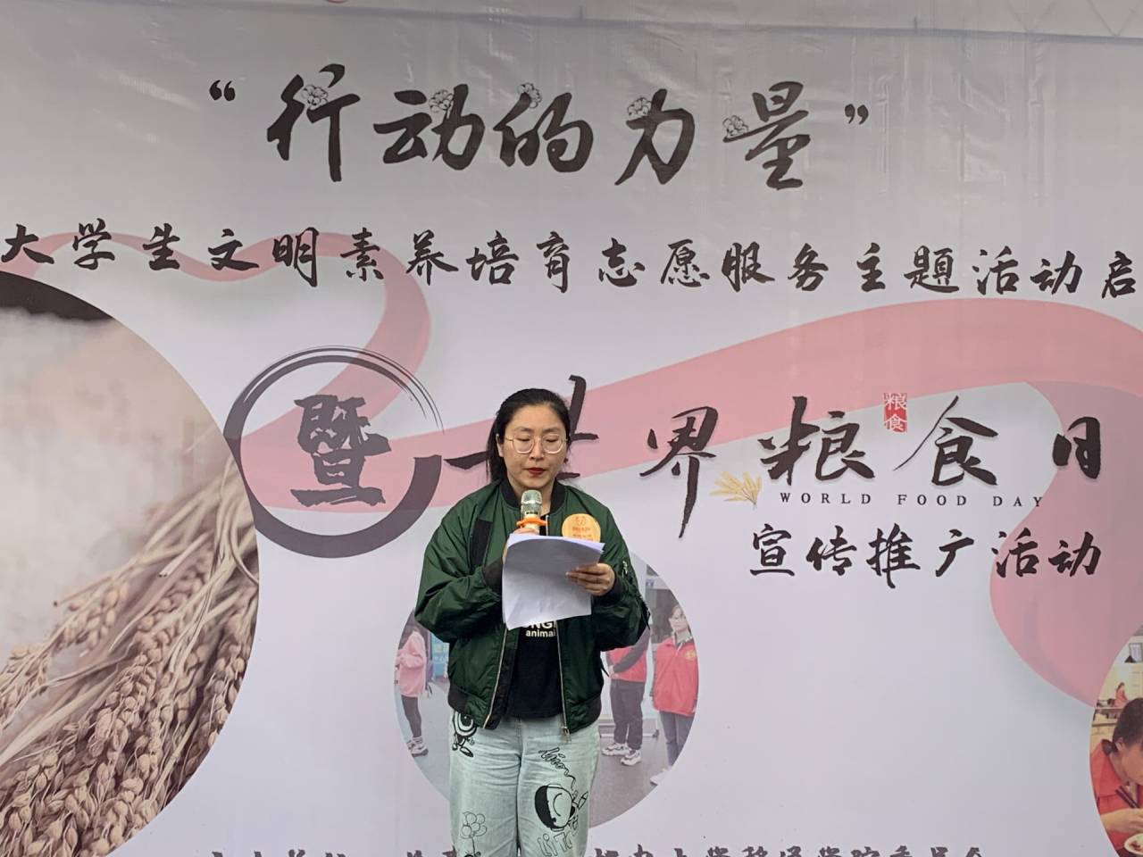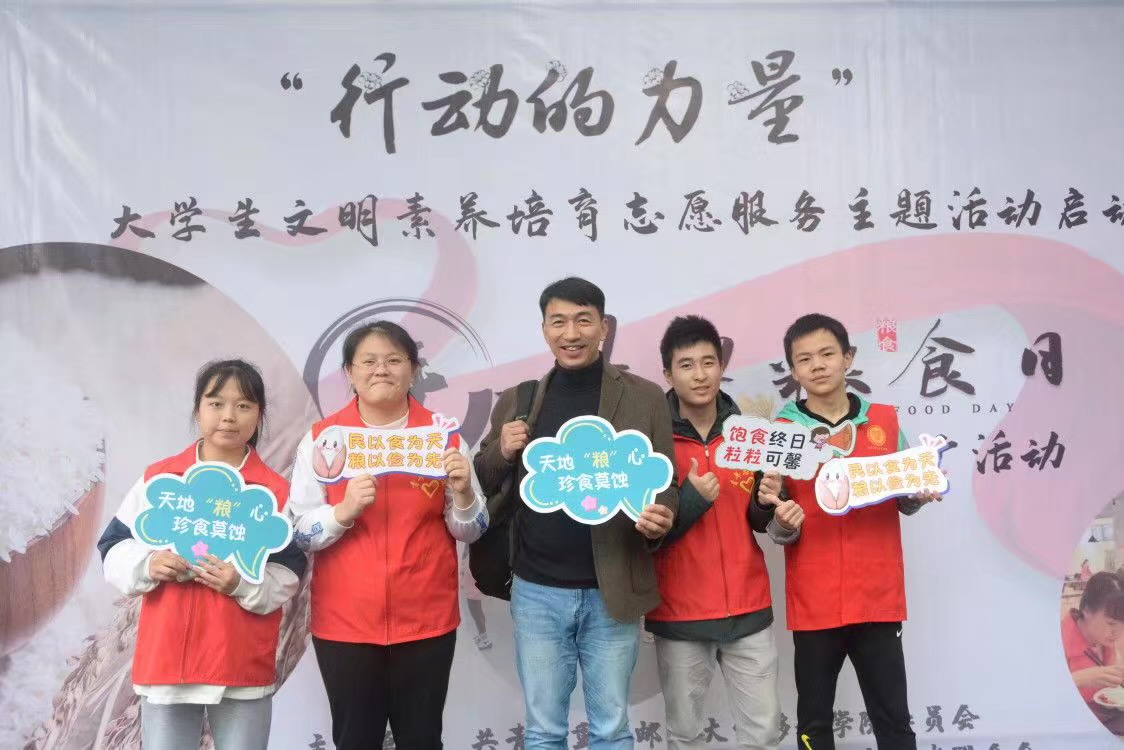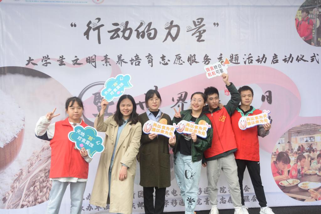 为营造文明移通氛围,为全校师生提供一个文明有序的工作和学习环境,用“行动的力量”影响移通学子提升学生公德素养,促进学生“德智体美劳”全面发展。结合《关于坚决制止学校餐饮浪费行为切实培养学生节约习惯的通知》等文件,校团委于10月16日,在文峰食堂广场开展了“行动的力量”大学生文明素养培育志愿服务主题活动启动仪式暨世界粮食日宣传推广活动,志愿服务指导老师、“行动的力量”大学生文明素养养成志愿服务专项支队、各学院志愿者代表,全校共计300余人参加本次活动。