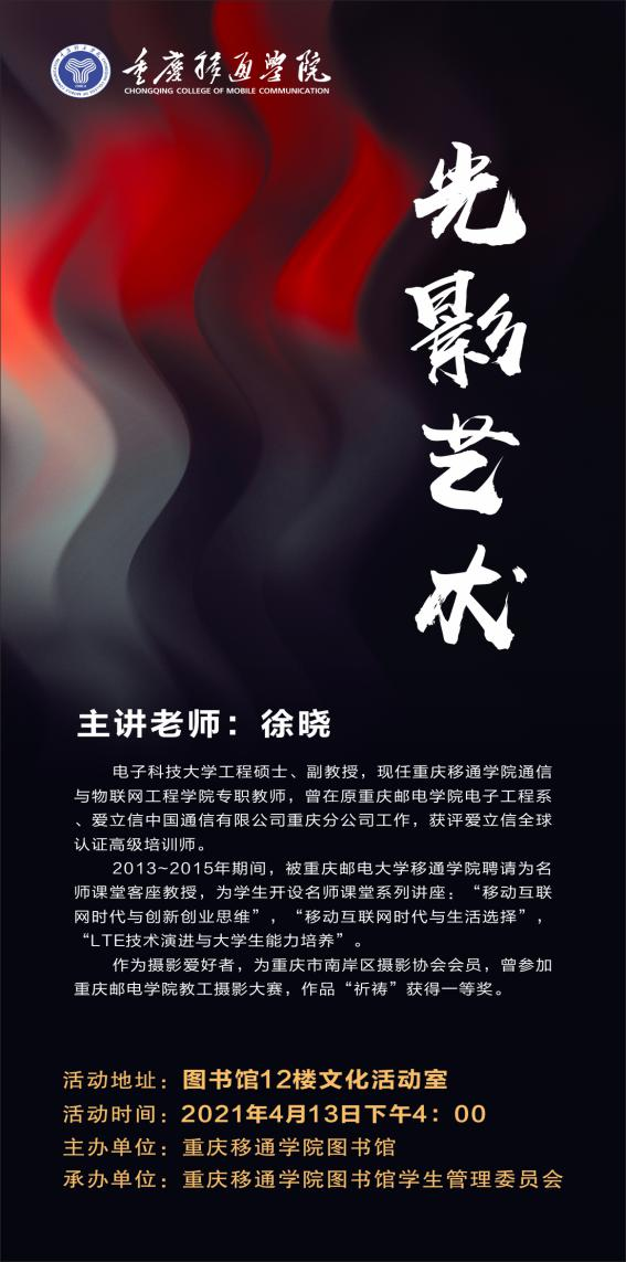 春回大地草长莺飞,万物复苏欣欣向荣。我校“双子湖”文化之“真人图书馆”活动于4月13日在图书馆12楼文化活动室成功开展,有幸邀请到重庆移通学院通信与物联网工程学院徐晓副教授作为本期“真人图书馆”分享嘉宾,进行以“光与影的碰撞”为主题的专业知识分享。