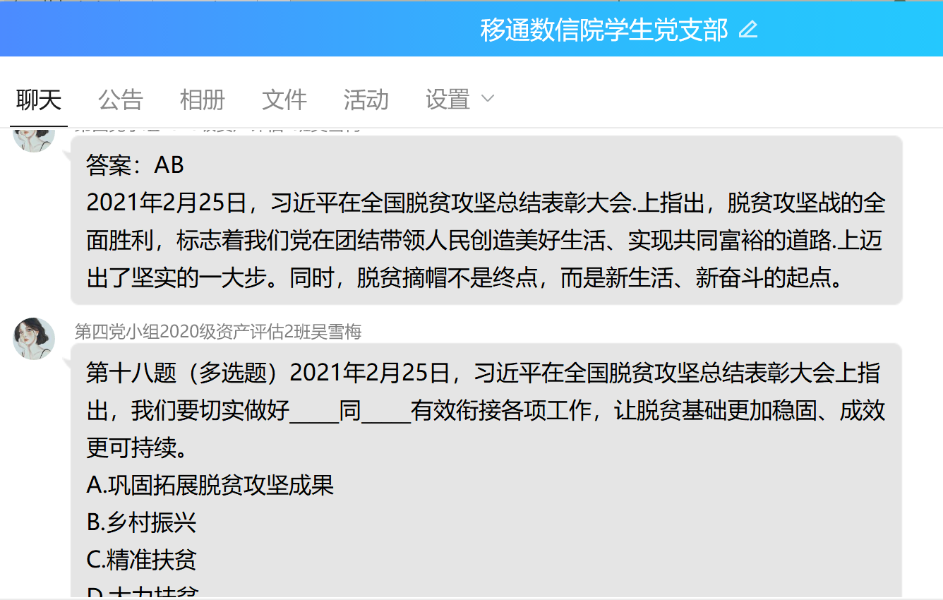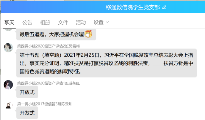 下午,支部脱贫攻坚专项线上答题比赛开始。比赛由支部宣传委员吴雪梅同志主持,全体成员积极参与。比赛采取积分制,按照党小组划分为四个小组,个人答题计入小组成绩,最终答题分数最高的小组积4分,第二的小组积3分,以此类推。