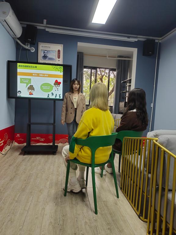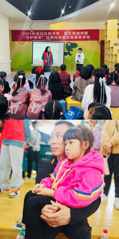 阳光明媚,微风和煦。3月13日杨倩老师、周密老师、邓露露老师带领“守护青禾”志愿者支队来到合川区图书馆开展“远离性侵害”志愿服务活动。活动在家长及儿童的期待中开始,李沅洪同学用“大门关好,小狗看家”的游戏来端正孩子们的行为,让孩子们在轻松愉快的氛围中学习正确的防性侵知识。此次活动由于有家长的参与,课堂上各位老师利用提问等互动的方式,给家长和儿童带来了一场别开生面的课堂。看见孩子们脸上的笑容,家长的认真聆听,深深打动了我们的老师和同学们,也激励着志愿者支队同学们不断进步。课后,我们给每一个孩子发放了女童保护防性侵手册,方便他们回家和父母继续一起学习防性侵的知识。
