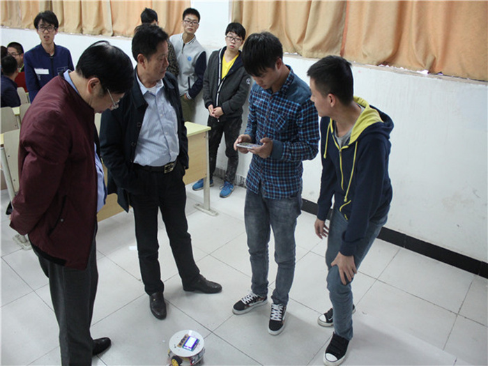 经过层层的筛选,最终有20组参赛作品进入决赛,并于2016年10月12日在第二教学楼404教室举行决赛答辩,答辩组专家由通信与信息工程系主任毛期俭教授、自动化系主任汪纪锋教授、计算机系主任郑先锋教授、数理教学部谢国亚教授和自动化系张抗美高级工程师组成。参赛者们用自己的大智慧来谱写自己的荣誉。在决赛答辩中,无论是邓磊学长的机器人三维仿真及实物演示,还是李伦学长组的循迹避障小车,亦或者是王浩学长的智能机器人都显示出参赛者们背后的牺牲和努力。每一个模型的制作和控制系统的设计都需要努力学习计算机以及电子学的知识,那么这些时间哪来的呢?暑假的准备,课后的钻研,只为了满足内心的那一份执着,收获那一份美好的惊喜,让心中之梦腾飞。经过激烈角逐,由唐世清、邱龙、李铃玉组制作的道路清障智能机器人荣获第一名。