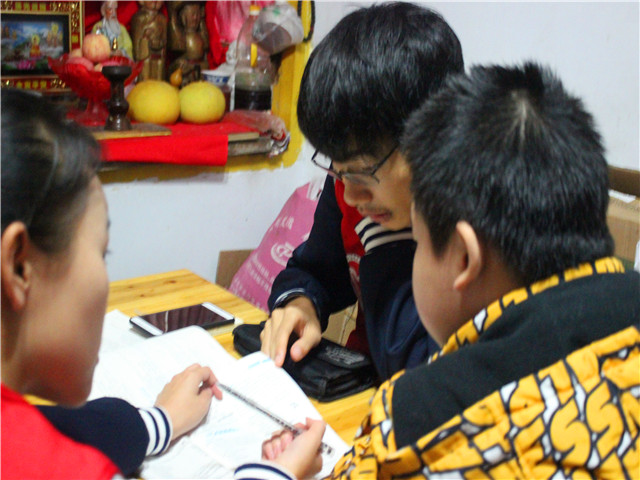 推开房门,王杰小朋友和往常一样全神贯注的在做作业,甚至没有发现小e们的到来。性格内敛的他,平日里不愿意主动去交朋友,也不愿意与周围的小朋友一起玩耍。但面对小e志愿者们,他显得开朗活泼,从进门开始就黏着志愿者们讲自己近况,虽然琐碎,但却很温暖。是陪伴给予了他温暖和微笑的力量。小e们还耐心仔细的为王杰小朋友讲解文言文的翻译,听着小e的讲解“这个是通假字,这个是人名......”。他的脸上露出了幸福的笑容。