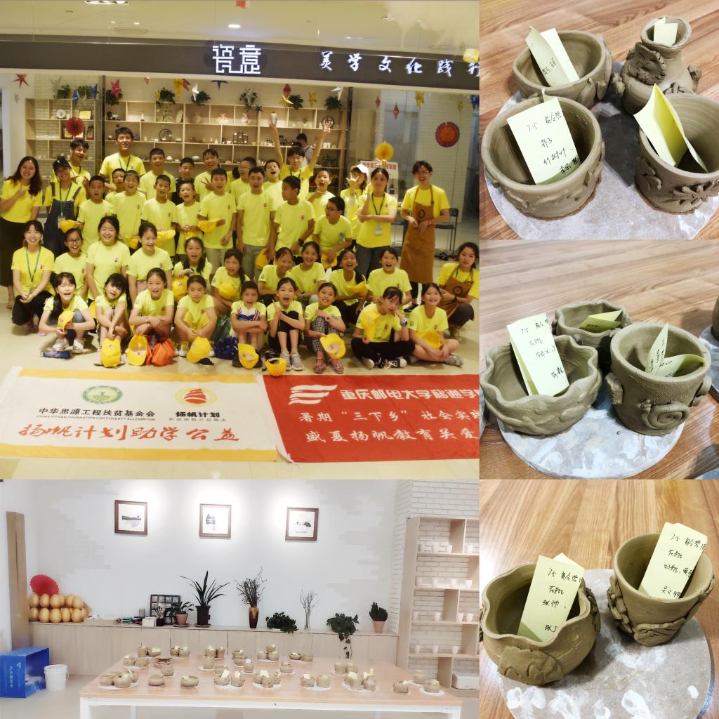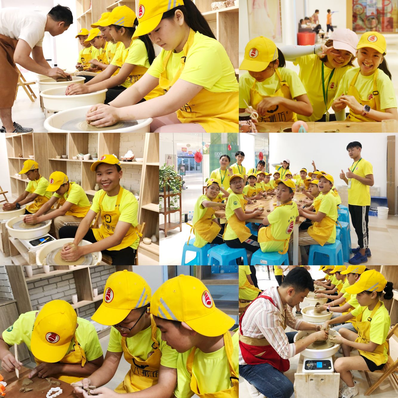 午休小憩后,迎来了开营后的第一堂课——陶艺童年体验课堂。在去往陶艺馆的途中,毫无征兆的下起了雨,这也应证着“重庆的天,像娃娃的脸,说变就变”这一俗语,着实给营员们出了一道难题。但大雨浇灭不了营员们的热情与期待,他们反而更加坚定了自己前行的步伐。在陶艺体验馆,小朋友在专业老师的协助下亲手打造了属于自己的花盆、水杯、盘子等等作品。志愿者随机采访了几位营员课程体验感受,一位乡村营员激动说到“这是我第一次来做陶艺,以前也会玩儿泥巴,但是不知道泥巴可以这样玩儿,我希望后面有更多这样的课程”。憨憨的声音和眼神中,透露着无比的期待,其实此次陶艺体验课程目的,不仅为提高营员的动手能力和想象力,更多的也是想让乡村留守儿童开拓视野,打开固封的思维,去感受世界的美好。
