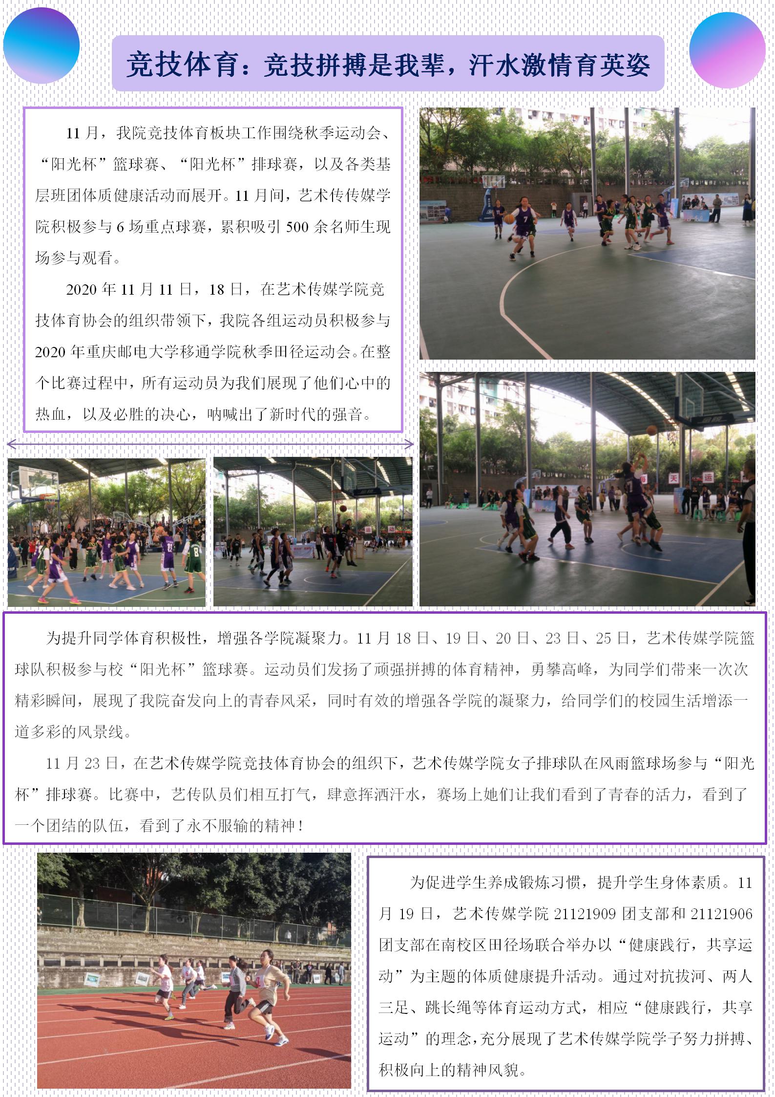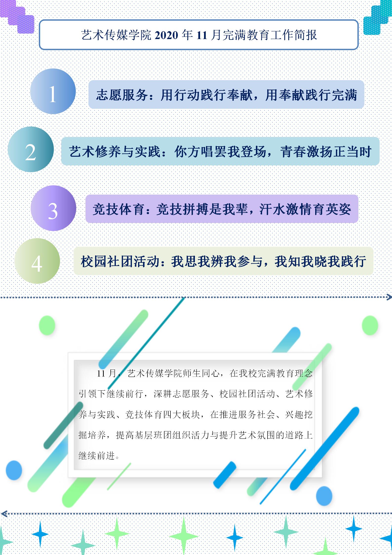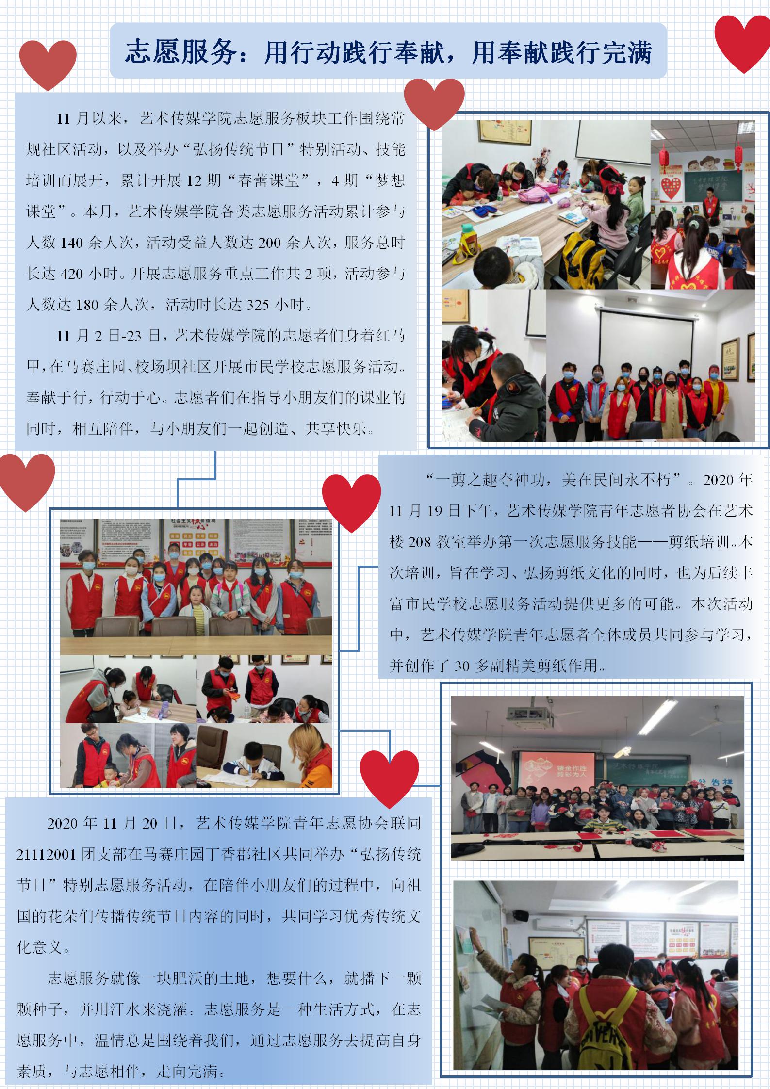 11月,艺术传媒学院师生同心,在我校完满教育理念引领下继续前行,深耕志愿服务、校园社团活动、艺术修养与实践、竞技体育四大板块,在推进服务社会、兴趣挖掘培养,提高基层班团组织活力与提升艺术氛围的道路上继续前进。
