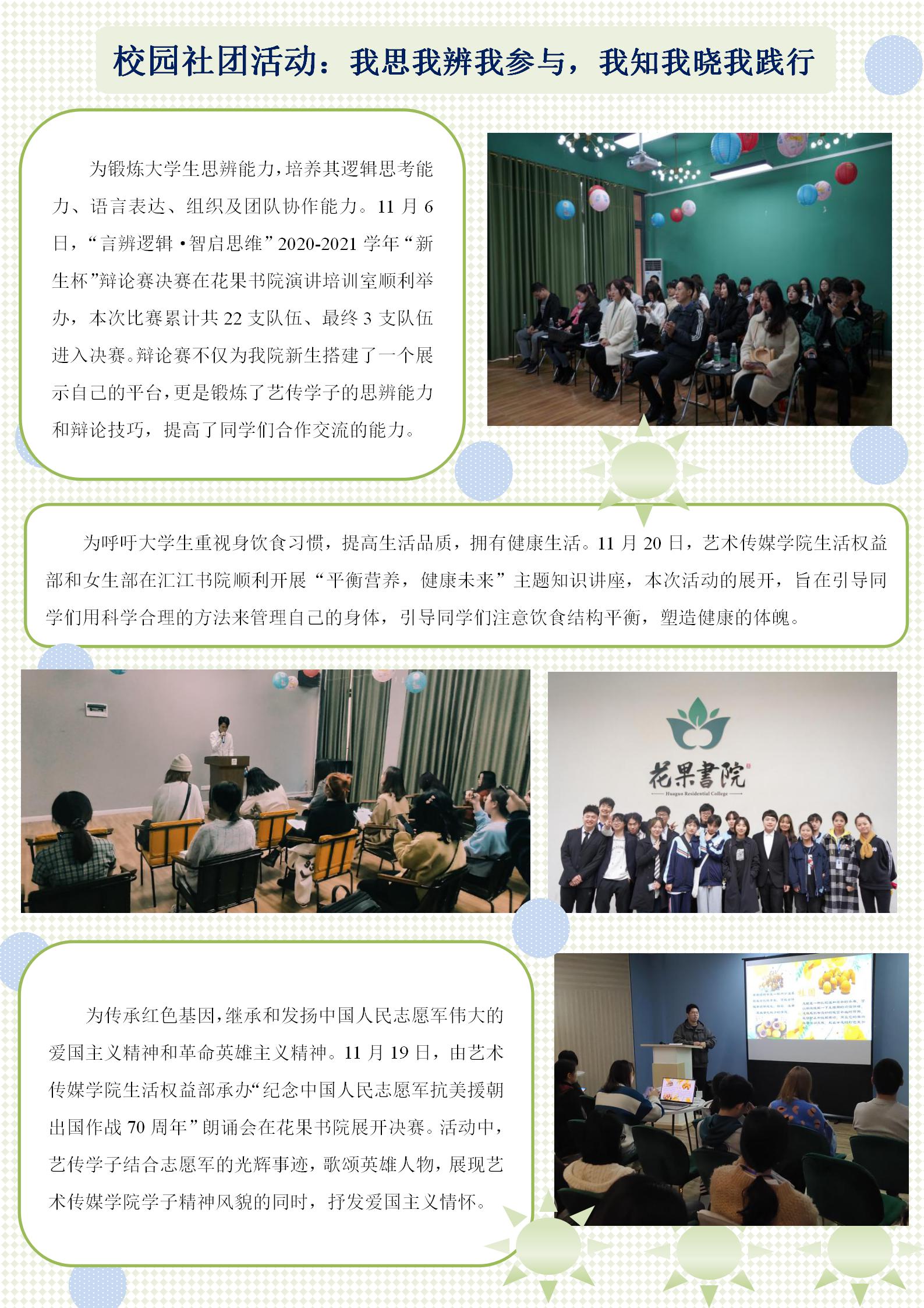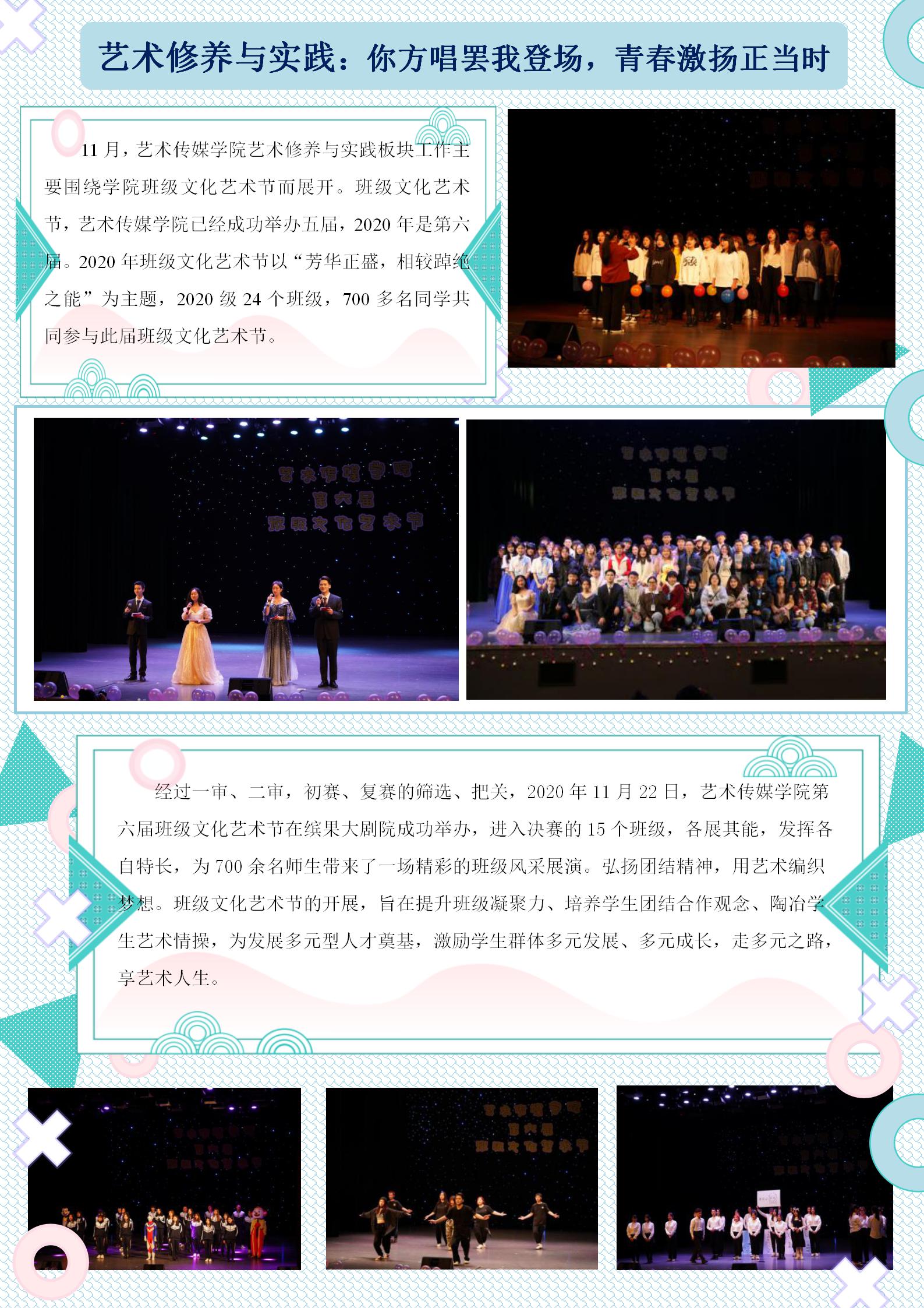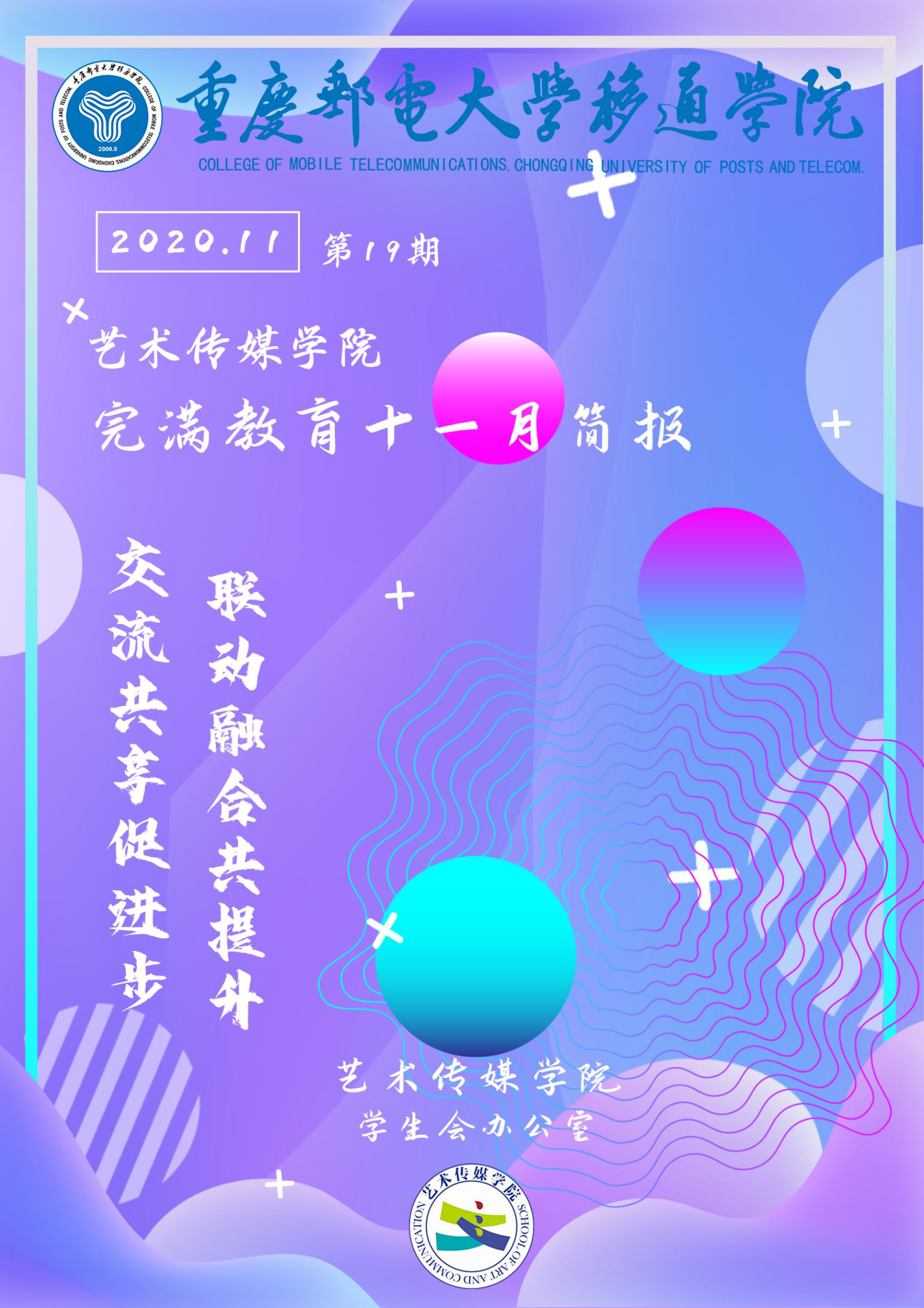 11月,艺术传媒学院师生同心,在我校完满教育理念引领下继续前行,深耕志愿服务、校园社团活动、艺术修养与实践、竞技体育四大板块,在推进服务社会、兴趣挖掘培养,提高基层班团组织活力与提升艺术氛围的道路上继续前进。