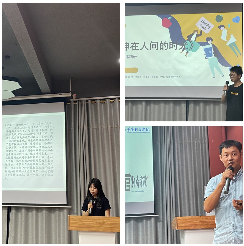 第一位陈述的是2020级通信工程4班王慧同学,她和组员们陈述的主题是“阿伽门农故事”,该组对人物关系和故事进行梗概,并重点突出了该故事中“以恶报恶的循环”、“血亲复仇中的伦理冲突”、“人与神的冲突”等关键点。第二位陈述的同学是2020级电信工程及管理1班的毕恩康,他和组员们主要根据《神在人间的时光》这本书中的内容,讲解了海神波塞冬、复仇女神以及美杜莎的故事。第三位陈述的是2020级轨道交通电气与控制1班的刘伸春子和孙妮君同学,他们小组陈述的主题是“特洛伊战争与金苹果的故事”,讲解了金苹果的由来、海神忒提斯的婚宴以及帕里斯与海伦的故事,其重点突出了特洛伊战争是希腊神与神、英雄与英雄、希腊人与特洛伊人之间的战争。