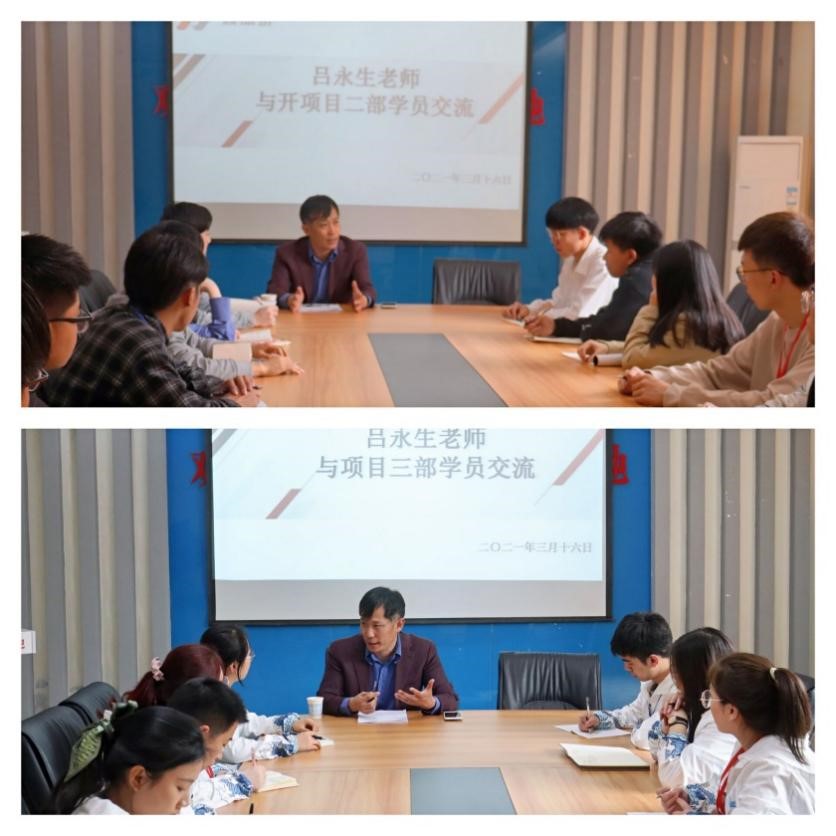 下午2点,吕永生老师分别与项目二部、项目三部学员交流,在交流中提到:在这个初级开发工程师永远过剩,高级开发工程师永远稀缺的IT新时代,自身要有过硬的技术能力,才能不被时代所淘汰。吕永生老师通过学员们现今面对的技术问题解答道:在学习计算机编程语言时不要只看语言本身,要多思考语言背后的逻辑与思想。同时在日常学习中学员们要保持耐心并与老师及时反馈交流,形成良好的自我心理暗示,积极主动去克服学习中的困难。