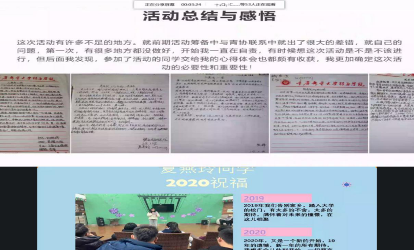 受疫情的影响,本次完超风采展示无法在学校开展,采用了线上QQ群投屏展示的方式,让各团支部之间进行学习与交流。即便无法进行面对面的交流,各团支部仍改变方式积极参加活动并进行了充分的准备。他们的讲解从活动策划筹备,人员分工,完超活动举办,活动收获总结四个方面展开,再次回顾当初的活动情景,讲述的同学的语言仍饱含激情,充满怀念。