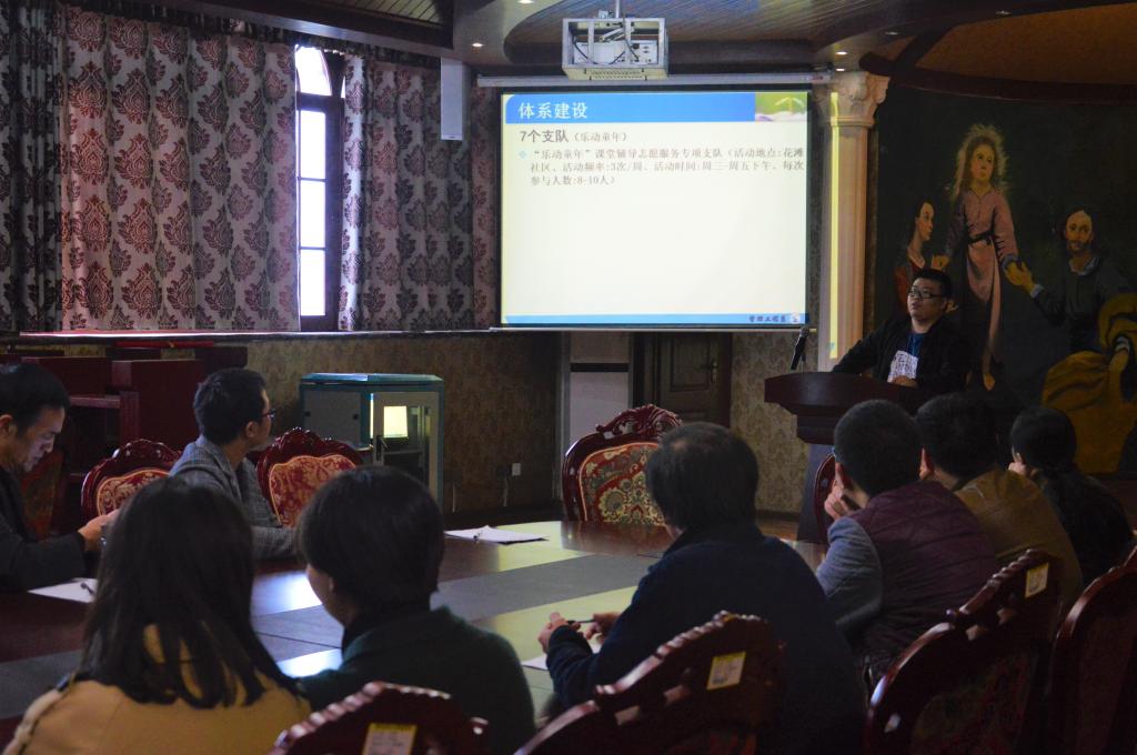 五个志愿服务基地分别是:花滩社区,合川图书馆,合川戒毒所,九九敬老院以及进士社区。管理工程系与这些基地有着长久而密切的合作。七个专项支队分别为:“纸鸢寄图书”科技教学进生活志愿服务专项支队,“春藤行动”帮扶身心障碍青年志愿服务专项支队,“马路天使”校内清扫志愿服务专项支队,“彩虹七巧”关爱青少年成长志愿服务专项支队,“乐动童年”课堂辅导志愿服务专项支队,“与心∙逾行”禁毒活动志愿服务专项支队,“影动夕阳”关爱失独家庭志愿服务专项支队。针对以上志愿服务专项支队,杨凯老师主要介绍了每支队伍的志愿服务工作,在各项介绍结束之后,还向大家展示了志愿活动现场的照片。