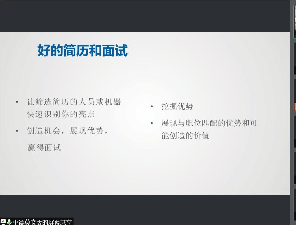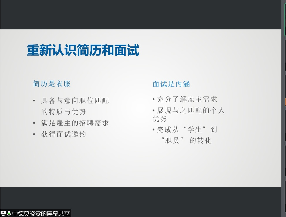 为了让同学们了解招聘需求,找到合适的岗位,莫晓雯老师让大家重新认识了简历和面试,以“简历是衣服,面试是内涵”来强调了了解招聘需求的重要性,一份具备与意向职位相匹配的简历,会提高雇主的面试邀约。莫老师用平实的语言传递了真切的希望,建议同学们找出自身与意向职位所匹配的优势和自身亮点,强调好的简历应重点突出个人亮点和优势,为面试官留下良好的第一印象。