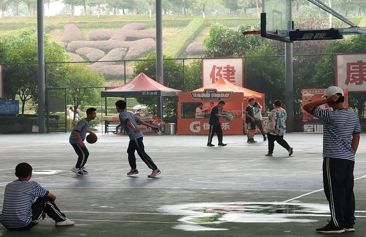 在C区训练的同学们,休息时约上三五好友相约篮球场,虽然大家现在还不熟悉,但爱好能让志同道合的人变得亲近。