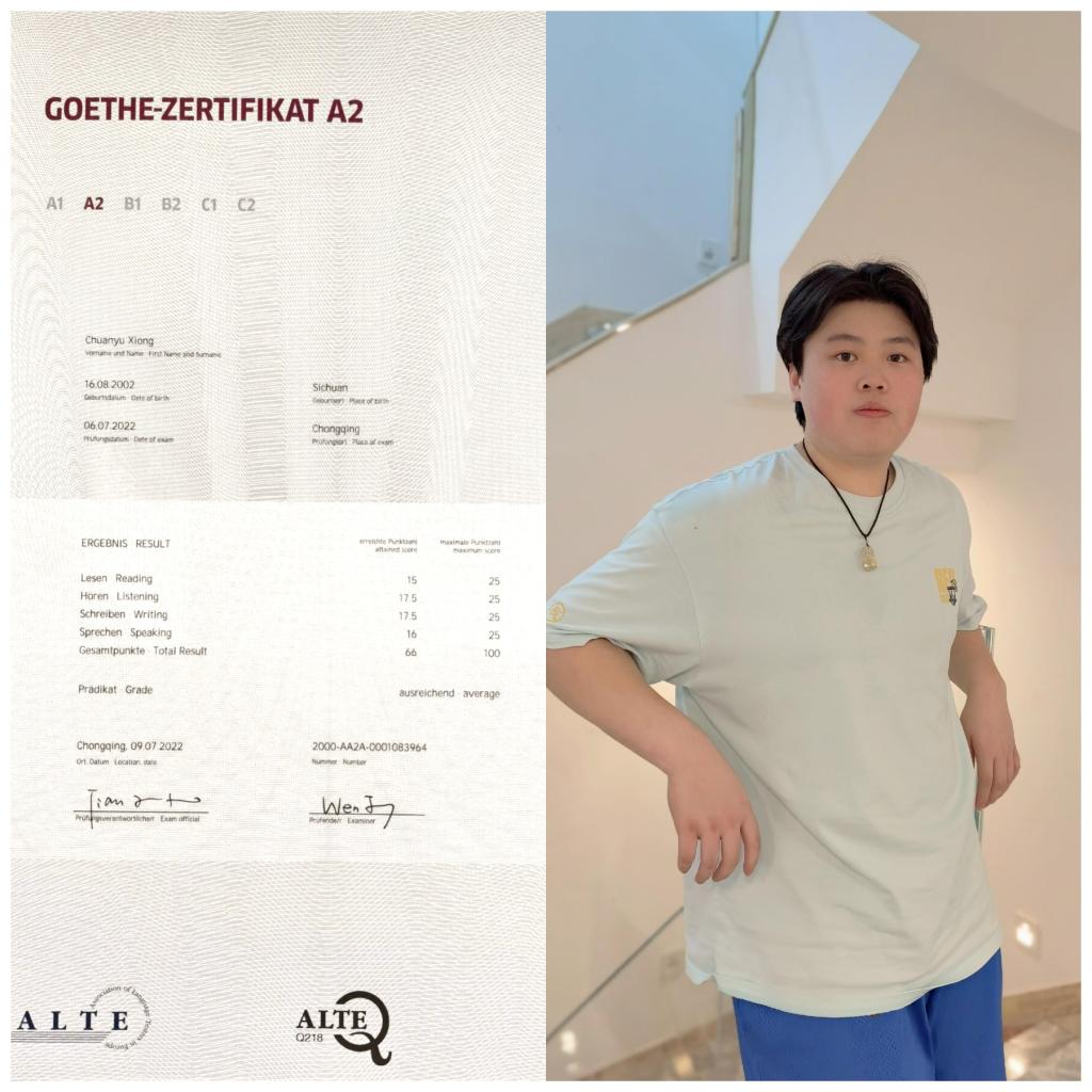 熊川渝同学仅用8个月的时间就通过德语A2考试,是我院师生同心、不断超越自我的表现,是我院对学生成长高度负责的体现,也是我院全面贯彻学校“四位一体双院制”人才培养模式,开展教学创新、实施全员导师制的成果导向。