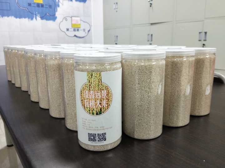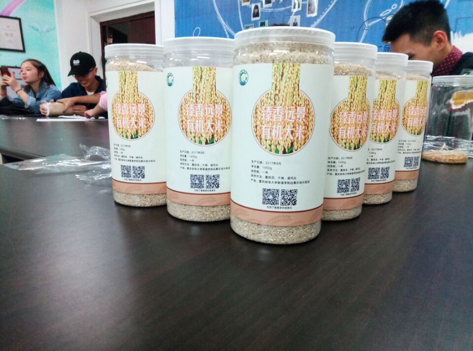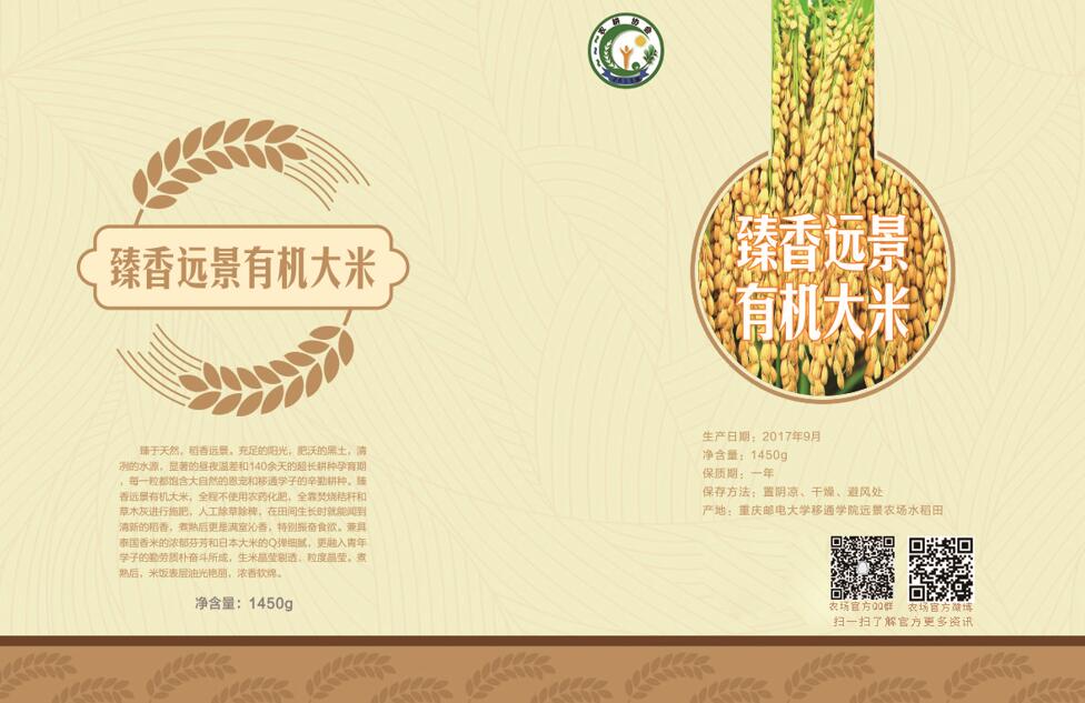 为了更好地展现同学们的劳动成果,突出农场稻米的原生态、绿色健康、天然有机,我们集结了市场营销、动画和广播电视编导专业的同学发挥他们的营销优势和设计优势,对远景农场产出的稻米进行取名,对包装进行设计,在既保证农场稻米来自于远景农场、来自于同学们亲自耕种的前提下,又能够获得一个响亮好记的名字,便于后期进行高端售卖,我们最终选取了“臻香远景有机大米”这个名字,臻,基本字意为“至,到”,引申为“达到(美好的)”臻于天然,稻香远景。与此同时,我们还根据市场需求,在脱粒时对稻米进行分别处理,分精米和糙米两种,从而满足不同人群的需求。