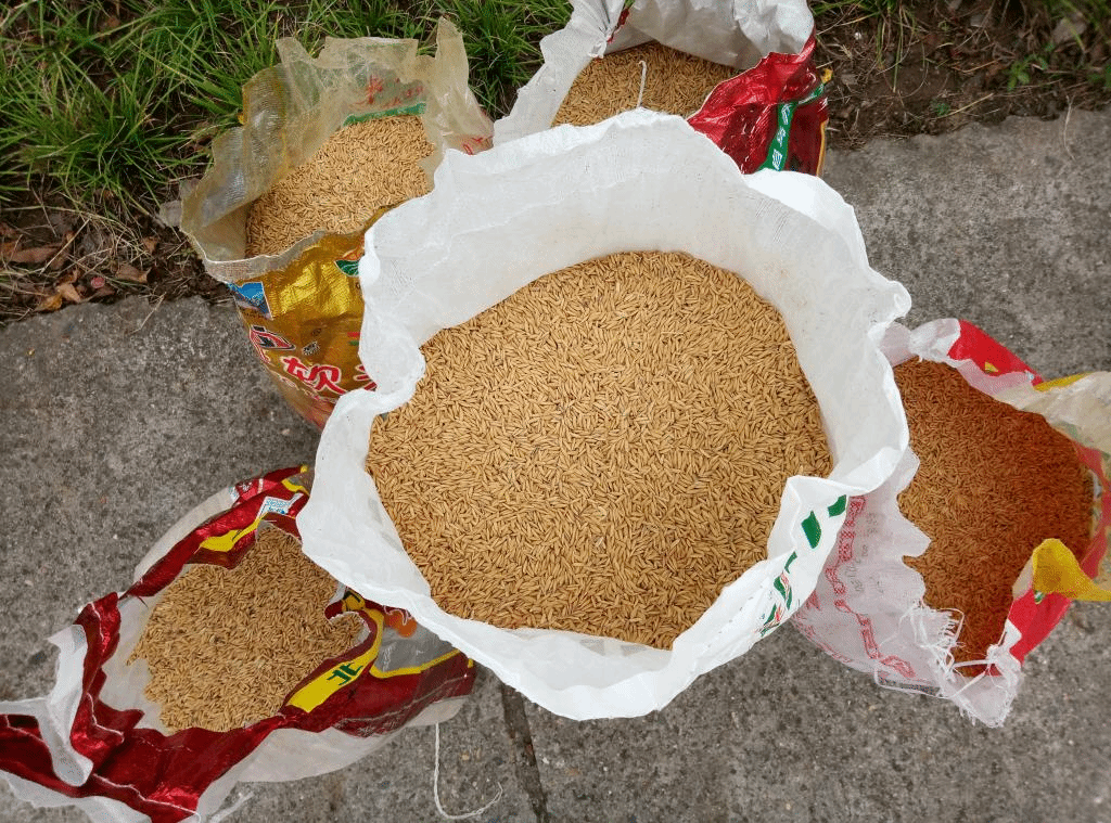 (水稻收割晾晒之后,240斤稻谷已做好装袋)