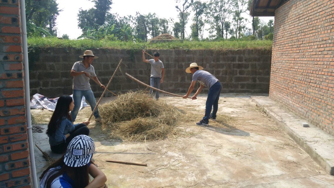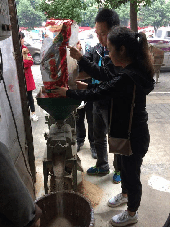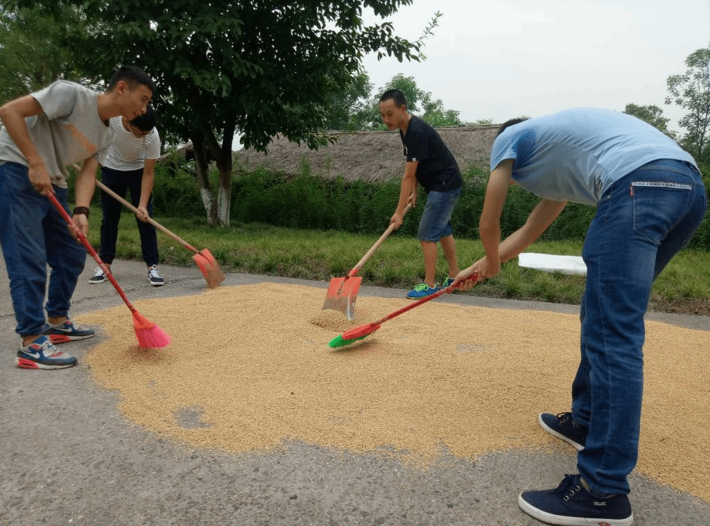 (同学们将晾晒完毕的稻米运送到附近的打米店脱粒)