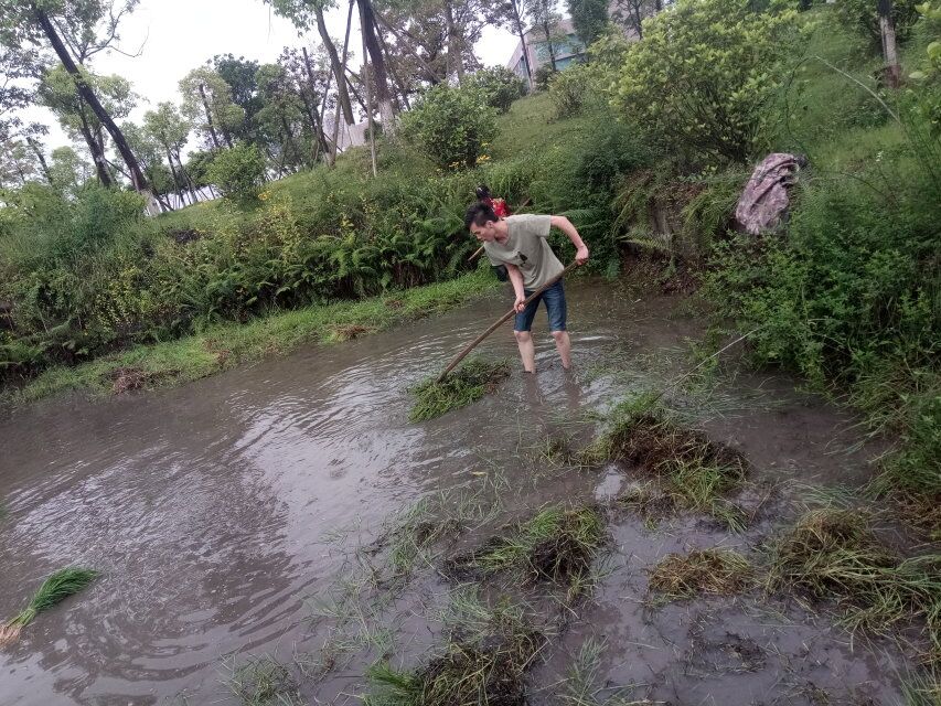 2017年5月1日,远景农场的同学们来到农场水稻田,对水稻田进行清淤、翻整、清除杂草,水稻田里生长着许多容易划破皮肤的水草,也滋生出了蚊虫和蚂蝗,大家克服着内心的犹豫和胆怯,鼓励着自己勇于突破和挑战,在恶劣的水稻田里认真地劳动着,为自己送上了一个不一样的光荣的五一劳动节!