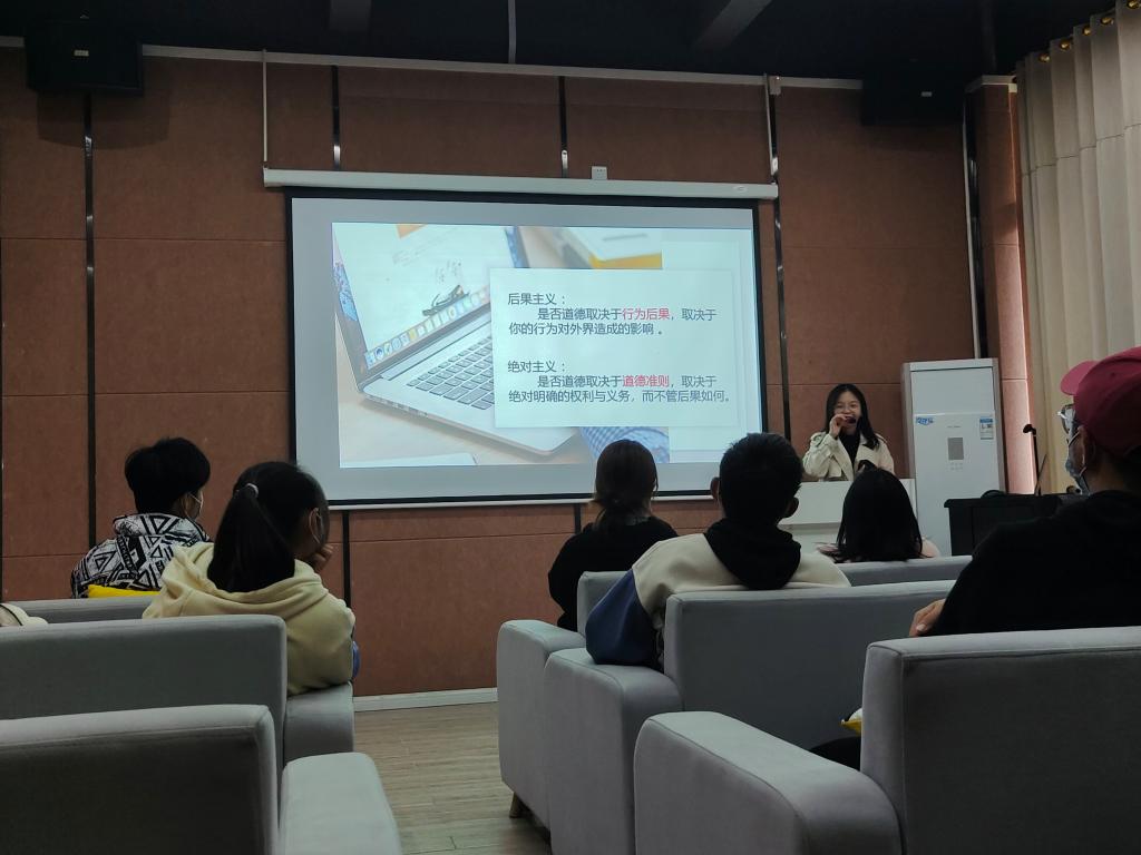 问题一经提出,在场同学们都积极地表达自己的观点:有人认为不应该推动拉杆顺其自然;有人认为应该牺牲小部分拯救更多的人;还有人认为生命是无价的,不可衡量。在激烈讨论和分析后,李洋老师强调此问题应当从后果主义(是否道德取决于行为后果,取决于你的行为对外界造成的影响)和绝对主义(是否道德取决于道德准则,取决于绝对明确的权利与义务,而不管后果如何)两个层面去解读。