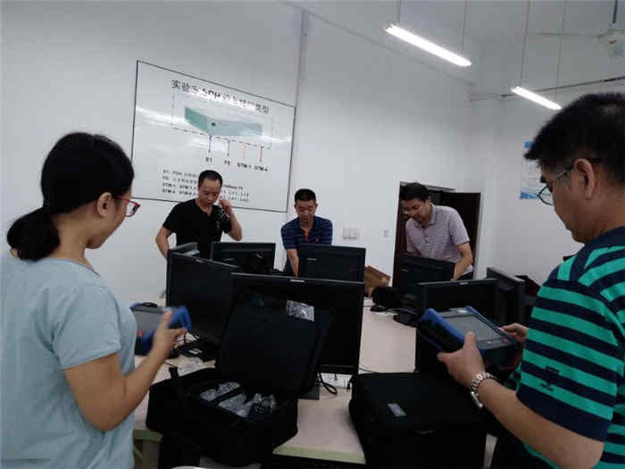 近日,我校大手笔为通信与信息工程系的“光通信网实验平台”购进了一批新的仪器设备。2017年9月21日下午,设备厂商专程派技术人员前来给老师们培训,一时间,S1201的光纤通信实验室人满为患,同事们争先恐后、迫不及待地想一睹它们的风采。通信技术教研室主任易红薇副教授、《光纤通信与SDH》课程负责人周忠伦老师以及课程主讲人和各位对光纤通信感兴趣的同事们纷纷前来,大家积极交流,主动探询各个仪器仪表的功能和使用方法。