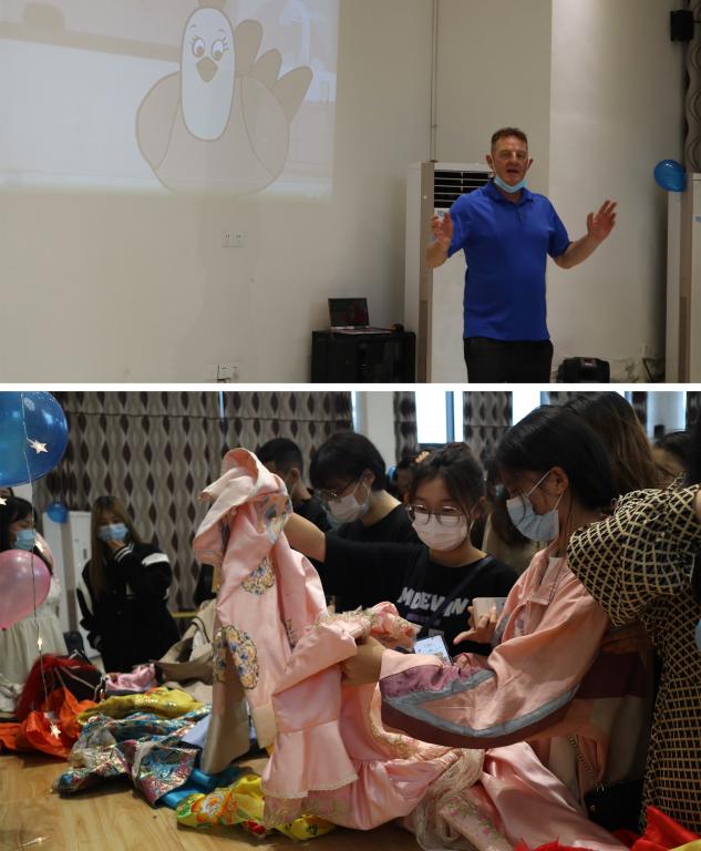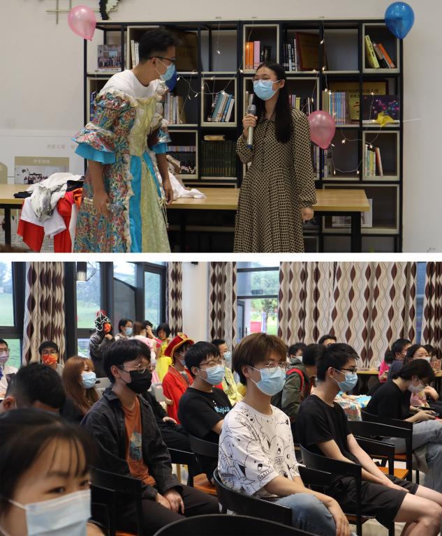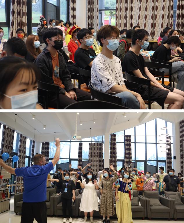 活动伊始,以三声hello,一场由外教Mike带动全场的小鸡快跑的童趣舞蹈就此开场。大家都沉浸在舞蹈的喜悦时,随着音乐结束,外教Mike也开始宣布活动规则——自选服装,自编自演,小组形式,全程英语。