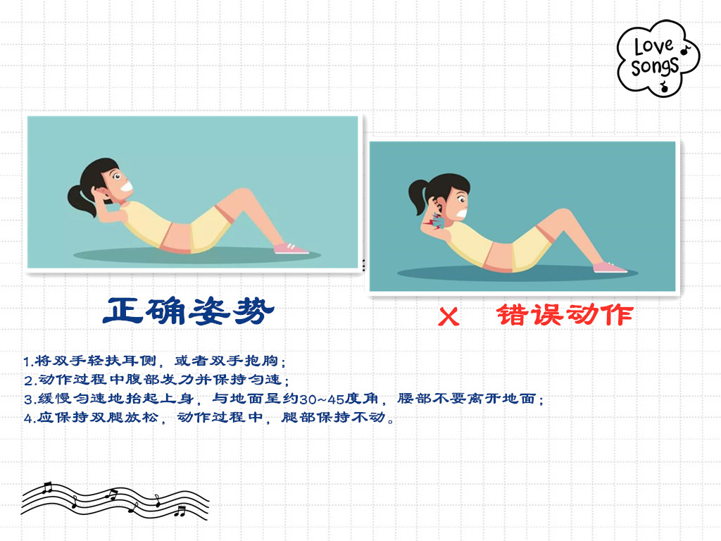 正确的做法:将双手轻扶耳侧,或者双手抱胸;动作过程中腹部发力并保持匀速;缓慢匀速地抬起上身,与地面呈约30~45度角,腰部不要离开地面;应保持双腿放松,动作过程中,腿部保持不动。