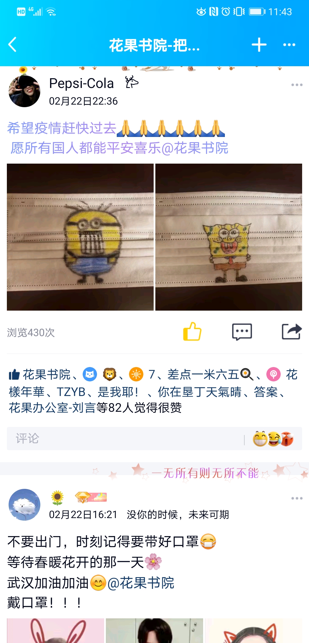 一年的花果时光转瞬即逝,时间来到了2019年9月。经过一年的等待,花果书院正式投入使用。从此,花果书院有了属于你们的活动、学习、锻炼的空间,有了供你们肆意挥洒青春的完满阵地。你们在这里结识、在这里相遇,在花果“七点半”中养成习惯,在花果家庭日里收获温情。2020年初,新冠疫情爆发,疫情隔开的是距离,但隔不开花果书院对你们的暖心陪伴。“微笑抗疫——把微笑戴回家”、“打破社交冰”、“学长有话说”等活动如期在线上开展,花果与你们相聚云端、隔空对话,将一个个活动从线下搬到了线上,只为给你们如家般的关爱。那段时间,你们与花果携手抗疫,共同期待“春暖花开”。