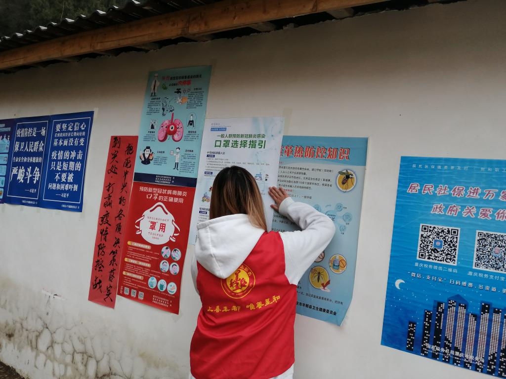 (杨静与村委会工作人员在文化墙上张贴疫情宣传单)
