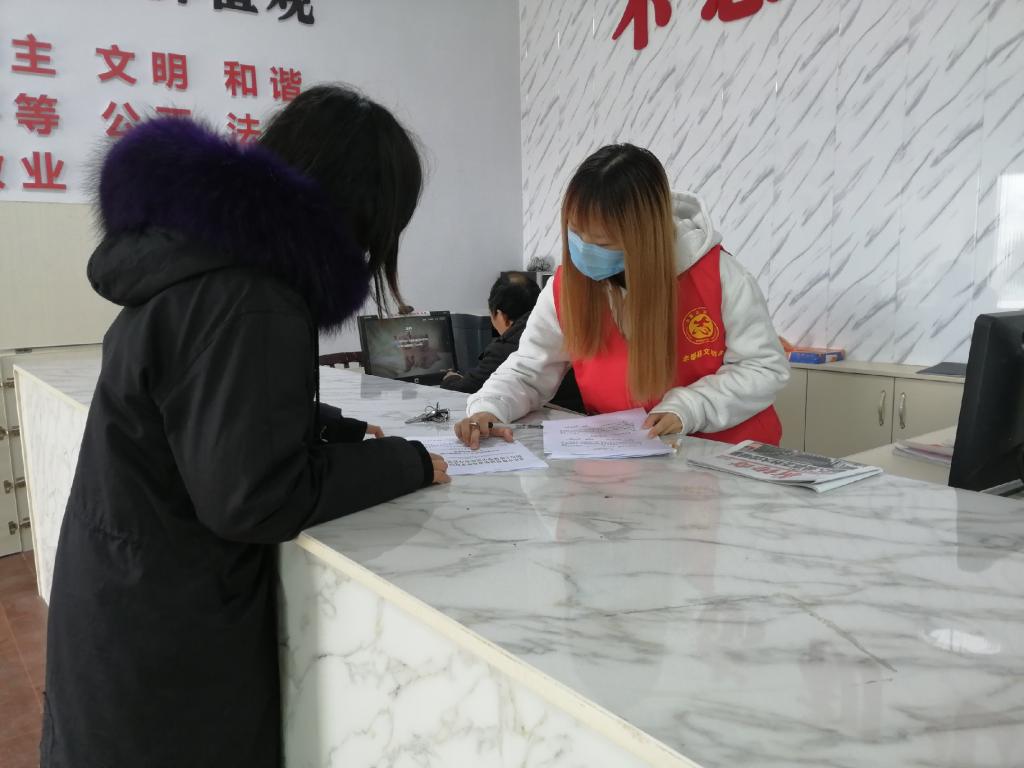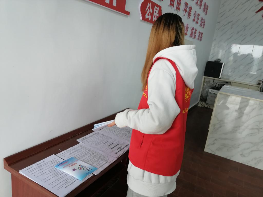 (杨静同学在三磊子村便民服务中心执勤时整理疫情宣传资料)