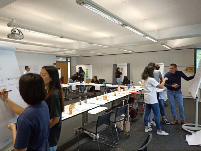 作为一名教师,交流过程中最难忘的就是课堂了。参与式、项目式、体悟式课程教学是德国的上课方式。这里的教师们首先都非常注重教学目标的实现,他们会在一天课业开始之前,介绍一下全天的课程目标,并且会分成几个具体环节来实现它。其次,他们还非常注重教学设计。虽然是金融课程,大家也基本没有专业知识背景,但是在一环扣一环的课程设计中,依托多样丰富的教学手段,大家都学习的非常投入,并且丝毫不会感到枯燥。再次,这里的教师非常敬业。很多老师来上课都会拖着行李箱,里面装满了各种各样的教学用具,从种类丰富的笔、纸张、游戏用具到笔记本、打印机,教授们都会自带。最后,这里非常注重自主学习。一般都是教授在介绍了学习设置的知识的背景后,学生们需要在课下完成大量的资料查阅、预习、作业等部分。老师们鼓励大家不懂就问,丝毫没有距离感,同学们感觉和他们相处起来轻松而融洽。