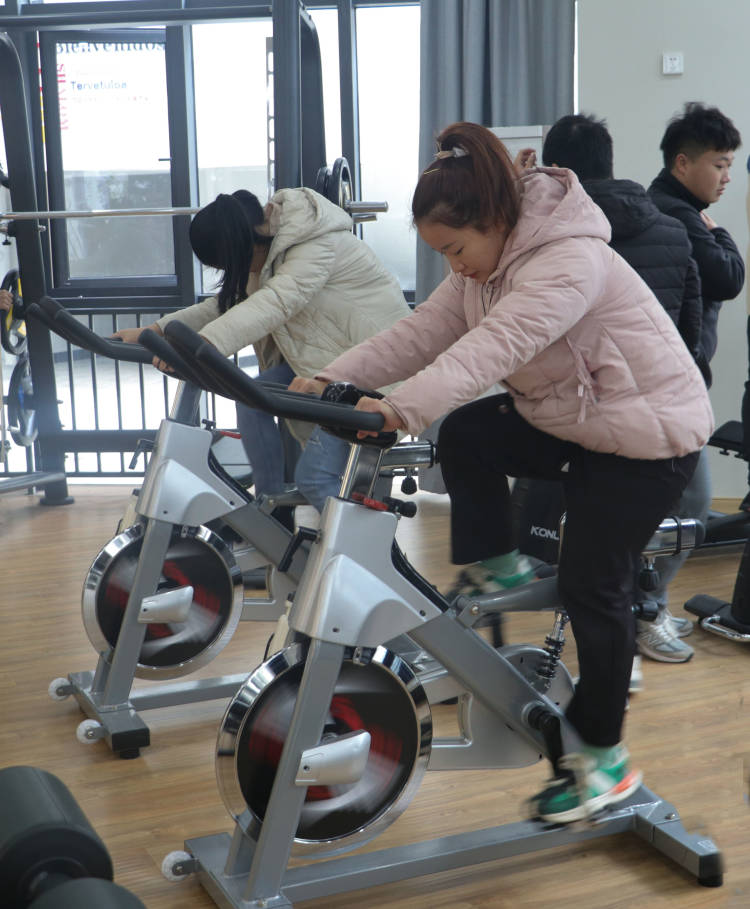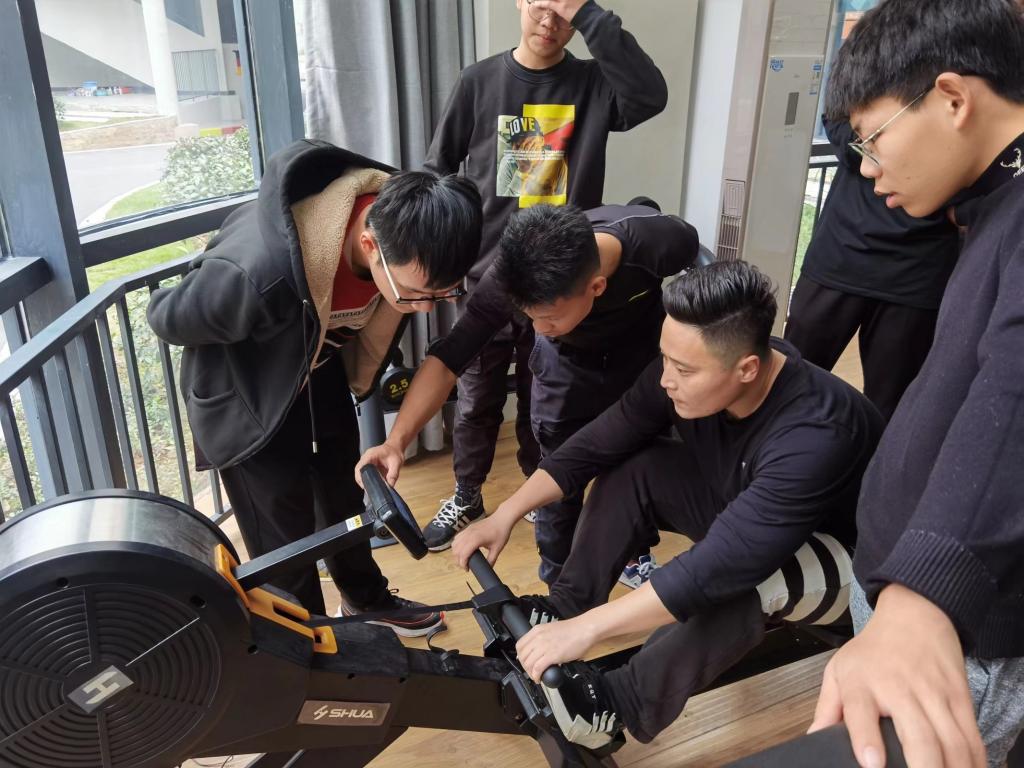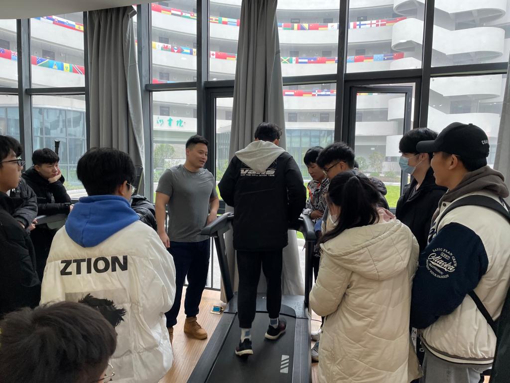 南湖书院健身房内,来自竞技体育中心的郑万达教练为到场同学们讲解完有氧运动的概念和分类后,邀请同学们通过实际体验跑步机、动感单车,学习掌握有氧运动的注意事项。