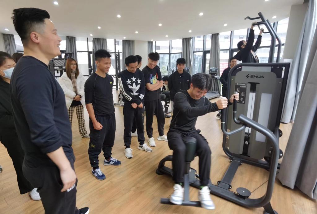 “练习举重的时候,注意要先摆好水平练习椅的位置,避免因为错误发力拉伤肌肉或脱力受伤。”为强化同学们对力量练习的理解、锻炼,郑万达教练逐一示范了南湖书院健身房内现有健身器械使用方法,并细致讲解动作规范,指点纠正同学们的错误发力方式及使用方法。