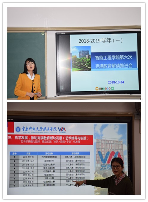 会议主要议程有三项,智能工程学院李巧副院长解读《重庆邮电大学移通学院学生完满教育委员会2018~2019学年目标规划与工作要点》;曹强老师、张溪老师就外出专业学习进行汇报分析;智能工程学院党晓圆副院长总结会议主要内容,明确本学年的专业教育与完满教育融合工作的开展方向和要求,会议议题明确,内容充实,气氛活跃,反响良好。
