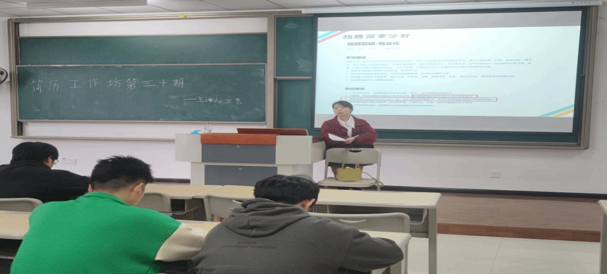 接着,王艺老师详细的从个人信息、求职意向、教育背景、奖励情况、个人技能、社会实践、自我评价、兴趣爱好等八个方面给同学们介绍了简历的制作方法和要点。强调了在“求职意向”中以“专业+职业”的格式来写的重要性。