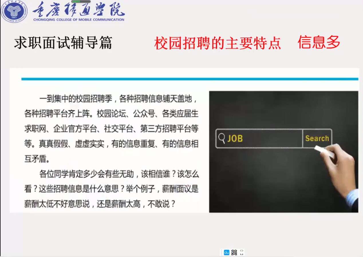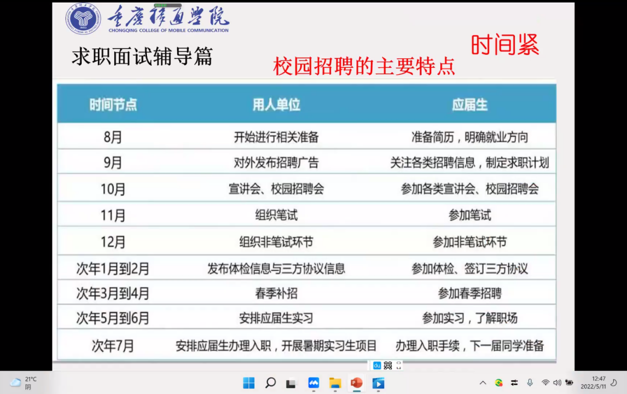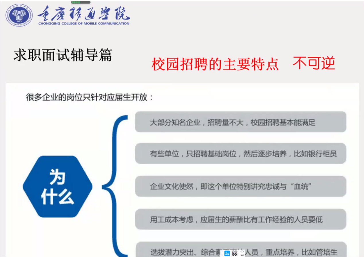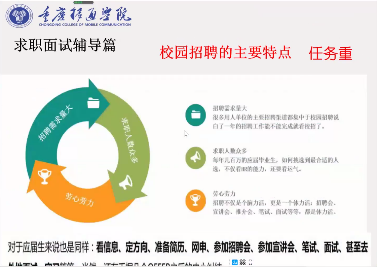 卢伯年老师用面试官跟大学生准备面试的过程进行比较,从时间、任务、信息以及针对性上,概括出校招时间紧凑、任务繁重的特点。对于面试官来说,应届生人数众多,难以筛选,而对于大学生来说,招聘信息太多,不好进行选择;在信息寻找上,有很多平台,信息都是虚实相结合的,应聘者很容易被骗;最后在针对性方面上,校招针对的是应届生,所以一旦错过是不可逆的。在不断讲解和介绍中,卢伯年老师为我们讲述了实习的重要性,在实习后,实习公司的很多岗位是会优先留着的,而且实习后,个人的综合素质得到提升,这也大大的提高了面试的成功率。