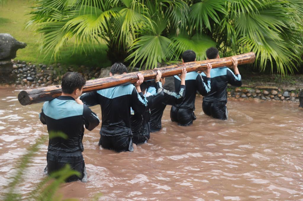 群龙戏水,同心协力迎战50个圆木深蹲。第六项领导力竞赛项目,全队队员齐上阵,在水中合力完成50个圆木深蹲。“1!2!1!2!”,选手们咬紧牙关,与队友们协力合作,在冰冷的水中仍然坚韧,在此刻,迸发出团魂!队友们相互击掌、拥抱,不仅突破自我完成了所有挑战,更在挑战中催生了友谊与领导力素养!