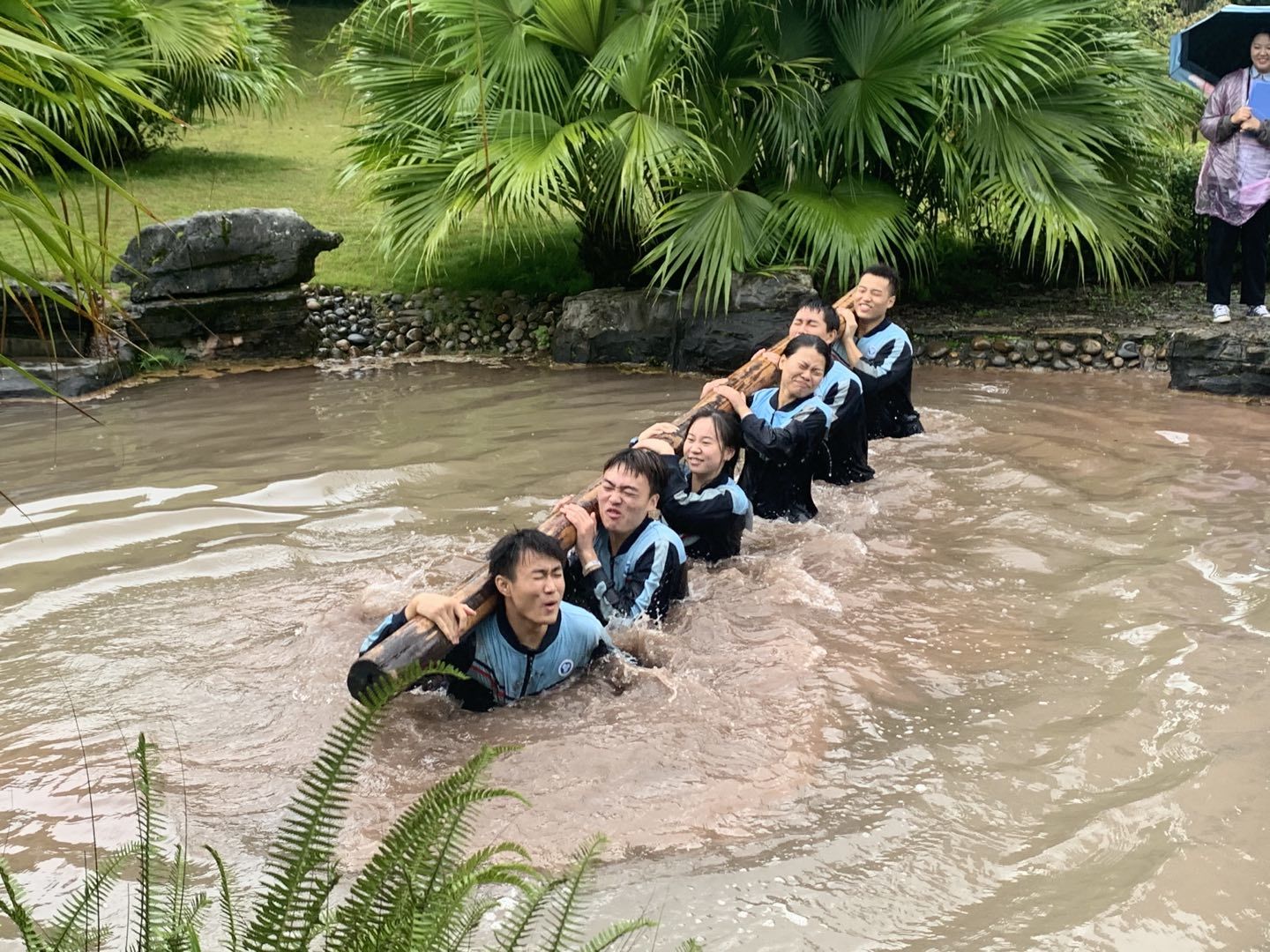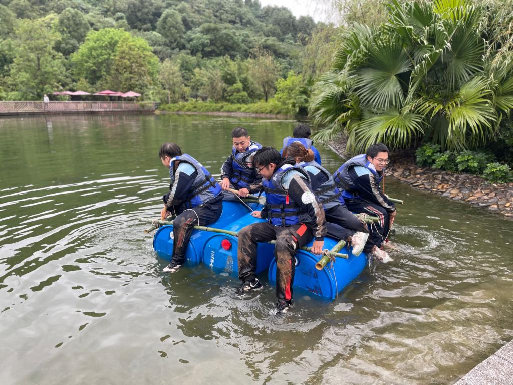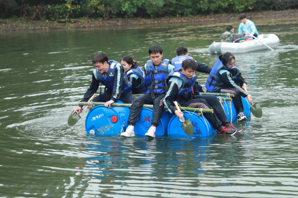 武装泅渡,汹涌澎湃共渡双子湖。每支队伍在队长有序的领导下,集思广益队员们各展才华的选手利用场地资源迅速扎结竹筏、共渡双子湖。