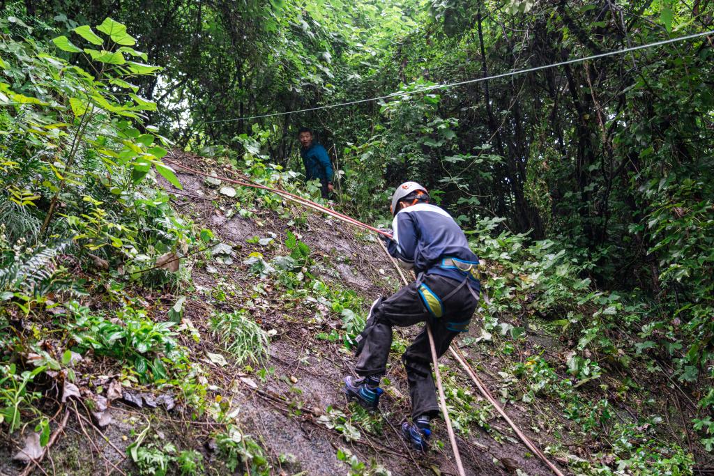 绝壁逢生,心中无畏速降花果山。在决策中博弈,每队推选两名选手穿戴好装备,克服恐惧心理一跃而下,空中的他们尽显矫健之姿态、肆意彰显青春之风貌。