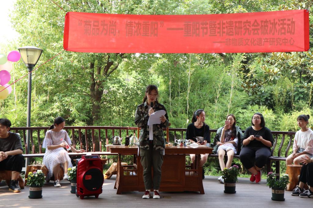 9月28日下午,由非物质文化遗产研究中心举办的主题为“菊品为尚,情浓重阳”的重阳节活动在非物质文化遗产传习基地(C区北山斋)展开。非物质文化遗产研究中心彭伟老师、李凤勤老师与学生研究员共聚一堂,投壶赏菊,饮茶吟诗,感悟传统节日文化。同时,借此佳节,开展了新一届学生研究员的破冰仪式,提高非遗团队的协作能力,增强团队凝聚力和向心力,促进非遗的新鲜血液更快的融入这个大家庭,加强非遗人之间的交流。