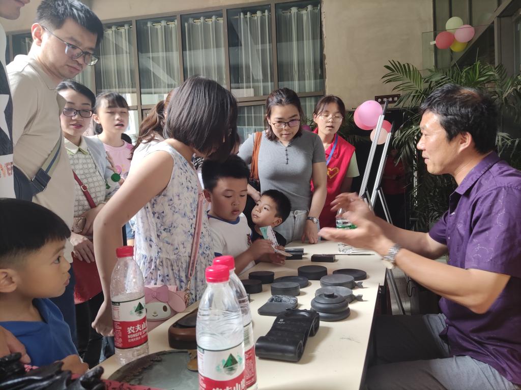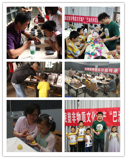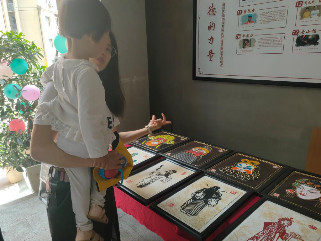 体验完瓦当拓印后,小朋友们在志愿者的带领下来到“合川区民间文艺家展演区”。本次展演主要包含了剪纸、叶画、峡砚、泥塑、面塑等。在峡砚展区,小朋友们聚精会神的听着非遗传承人易宗成老师对峡砚历史及雕刻技法的讲解,部分年纪稍大的小朋友还上手体验了如何雕刻峡砚。在面塑体验区内,在老师的讲解与教学中,小朋友同家长一起完成了面塑作品仙桃、葫芦和小牛等。在剪纸展演区,在家长的陪同下,小朋友们也是自然的参与到传统文化的体验中。