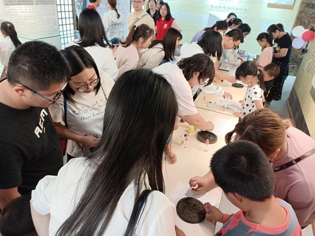 本次活动路线根据钓鱼城历史文化博物馆的布展路线进行,体验区穿插于参观路线之间,小朋友们可以边听一段讲解,体验一个区,听一段讲解再进行一段时间体验。活动伊始,小朋友和家长在博物馆一楼展厅登记处进行活动签到,并领取本次活动的货币“交子”。在经过一楼的参观后,小朋友们在志愿者的陪同下来到博物馆二楼展厅“瓦当拓印体验区”。瓦当俗称瓦头,是覆盖建筑檐头筒瓦前端的遮挡,是中国古建筑的重要构件,起着保护木制飞檐和美化屋面轮廓的作用。瓦当上刻有文字、图案,其图案设计优美,字体行云流水,极富变化,有云头纹、几何形纹、饕餮纹、文字纹、动物纹等等,为精致的艺术品。拓片,指将碑文石刻、青铜器等文物的形状及其上面的文字、图案拓下来的纸片,是我国一项古老的传统技艺,是使用宣纸和墨汁,将碑文、器皿上的文字或图案,清晰地拷贝出来的一种技能。